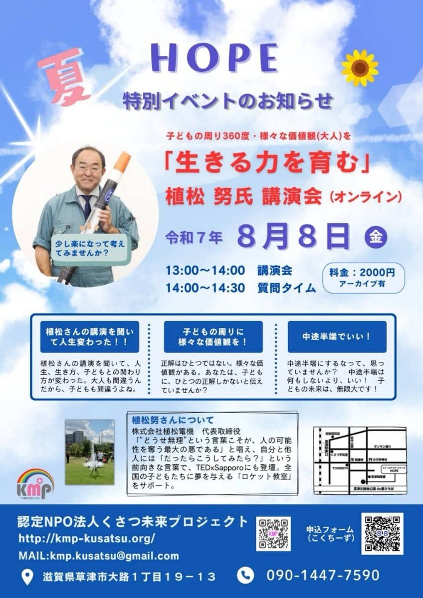 ●2024年8月8日「KMPサマースクール:植松努氏x安居長敏氏x加藤智博氏講演会」に10名でご招待します。