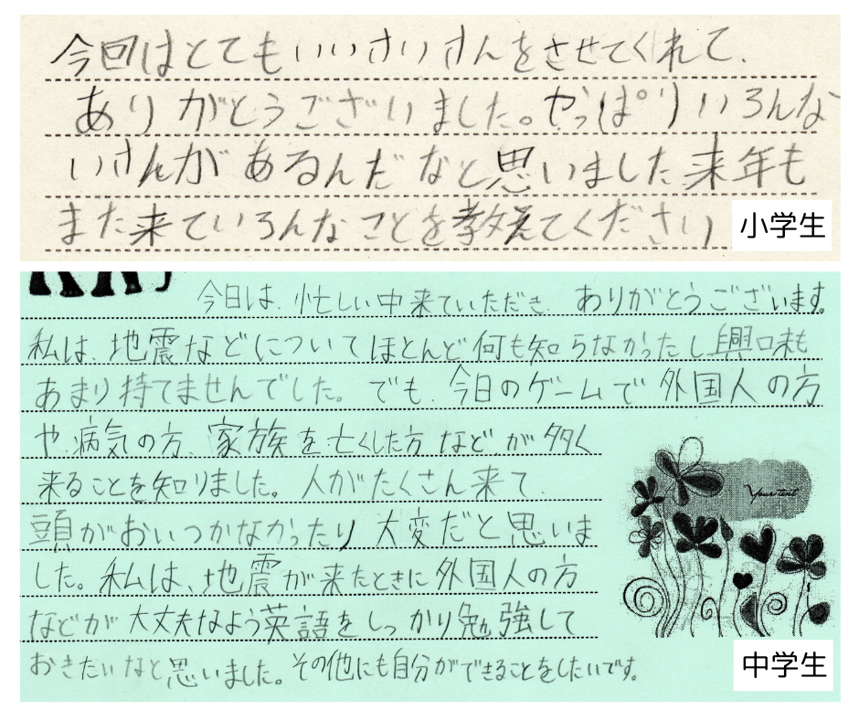 中学生は、避難所にいろいろな事情を抱えた方がやってくることを学び、その大変さを体感したことを書いてくれています。そして、いざという時のためにも、英語の勉強の大切さを感じ、自分にできることをしたいと考えていることに胸が熱くなりました。