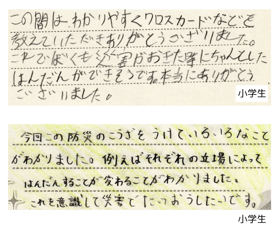 二人の小学生は、それぞれ違う回の授業を受けているのですが、どちらも「はんだん」について言及しているのが印象的でした。いざという時、咄嗟の判断で行動が変わり、選択した行動によって守れるものが変わる、ゆえにどう判断するかを知ることが何より大切だと考えています。