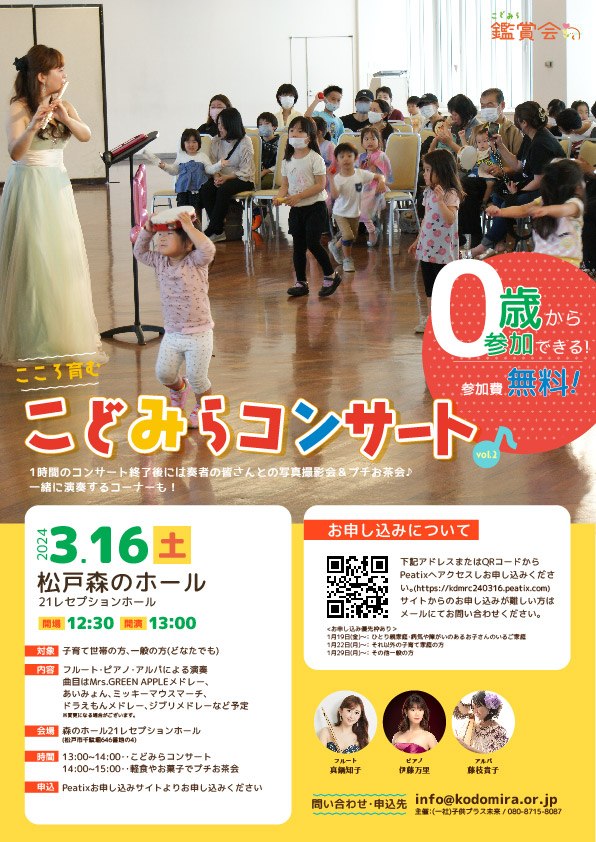 また、秋にはディズニーツアー、3月・5月・6月に音楽鑑賞会、8月には人形劇を開催予定。3月16日の“こどみらコンサートvol.2”は0歳から参加OKのコンサートで、今回はフルート・ピアノ・アルパの3名の方に演奏をして頂きます♪