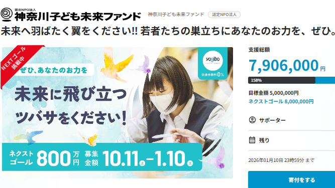 2026-01-08 15:47\クラファン残り3日!あと9万円4千円で達成します!/クラファン開始前には届かないように思われた500万円という頂上を通過し、もう少しで800万円というところまでたどり着きました。 翌年度のプロジェクト予算が確保できず頭を抱えていた10月から、なんと翌々年度のプロジェクト計画ができるところまできました。ここまでこのプロジェクトを押し上げてくださったのは、ご支援くださる皆さまです! 改めて、心より御礼申し上げます。 ぜひあと9万円4千円!ネクストゴール達成までもうひと押ししてください。 【かながわつばさプロジェクト】を皆さまと一緒に、社会に根付き、いつでも若者たちにのサポートができる事業に育てていきたいと思っています。 ネクストゴールを達成して、私たちの思いにこんなにも多くの方が共感してくださっていることを形にしたいです。 あと3日。引き続きのご支援をよろしくお願いいたします!2026-01-08 15:47\クラファン残り3日!あと9万円4千円で達成します!/クラファン開始前には届かないように思われた500万円という頂上を通過し、もう少しで800万円というところまでたどり着きました。 翌年度のプロジェクト予算が確保できず頭を抱えていた10月から、なんと翌々年度のプロジェクト計画ができるところまできました。ここまでこのプロジェクトを押し上げてくださったのは、ご支援くださる皆さまです! 改めて、心より御礼申し上げます。 ぜひあと9万円4千円!ネクストゴール達成までもうひと押ししてください。 【かながわつばさプロジェクト】を皆さまと一緒に、社会に根付き、いつでも若者たちにのサポートができる事業に育てていきたいと思っています。 ネクストゴールを達成して、私たちの思いにこんなにも多くの方が共感してくださっていることを形にしたいです。 あと3日。引き続きのご支援をよろしくお願いいたします!