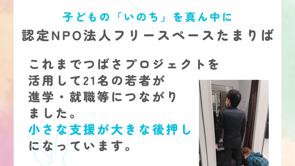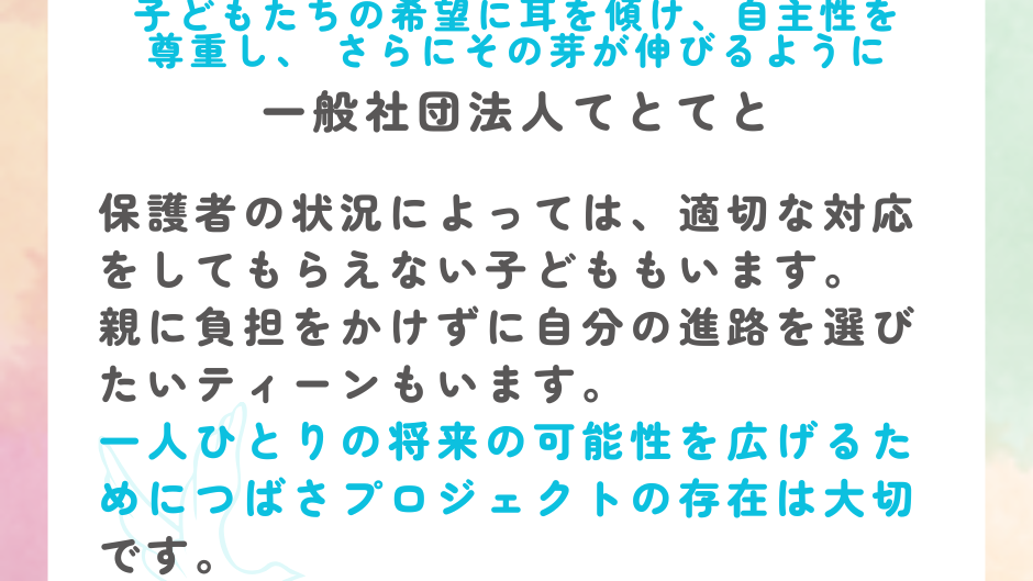 2026-01-06 10:40未来に羽ばたく翼をください!クラファン終了まで、あと5日。目標達成まで、あと少しです!この年末年始、つばさプロジェクトのクラウドファンディングに温かなご支援をお寄せいただき、心より感謝申し上げます。皆さまのお力が積み重なり、ネクストゴールまで残り15万円。終了の1月10日まで、あと5日となりました。 今回の挑戦を通じて、経済的な理由から進学や就職、一人暮らしをあきらめてしまう若者たちの声が届いています。 「受験費用を考えると、挑戦する勇気が持てませんでした」 「自立したい。でも現実は厳しくて…」 それでも彼らの胸の奥には、未来へ羽ばたきたいという小さな“翼”が確かに息づいています。 皆さまのご支援は、その翼が広がるためのあたたかな追い風になります。少しの応援が、若者たちに“自分にも飛び立つ力がある”と伝える大きな支えになります。 あと少し。どうかこの挑戦を、若者たちが未来へ羽ばたく力へと変えてください。最後までご支援をお願いいたします。2026-01-06 10:40未来に羽ばたく翼をください!クラファン終了まで、あと5日。目標達成まで、あと少しです!この年末年始、つばさプロジェクトのクラウドファンディングに温かなご支援をお寄せいただき、心より感謝申し上げます。皆さまのお力が積み重なり、ネクストゴールまで残り15万円。終了の1月10日まで、あと5日となりました。 今回の挑戦を通じて、経済的な理由から進学や就職、一人暮らしをあきらめてしまう若者たちの声が届いています。 「受験費用を考えると、挑戦する勇気が持てませんでした」 「自立したい。でも現実は厳しくて…」 それでも彼らの胸の奥には、未来へ羽ばたきたいという小さな“翼”が確かに息づいています。 皆さまのご支援は、その翼が広がるためのあたたかな追い風になります。少しの応援が、若者たちに“自分にも飛び立つ力がある”と伝える大きな支えになります。 あと少し。どうかこの挑戦を、若者たちが未来へ羽ばたく力へと変えてください。最後までご支援をお願いいたします。