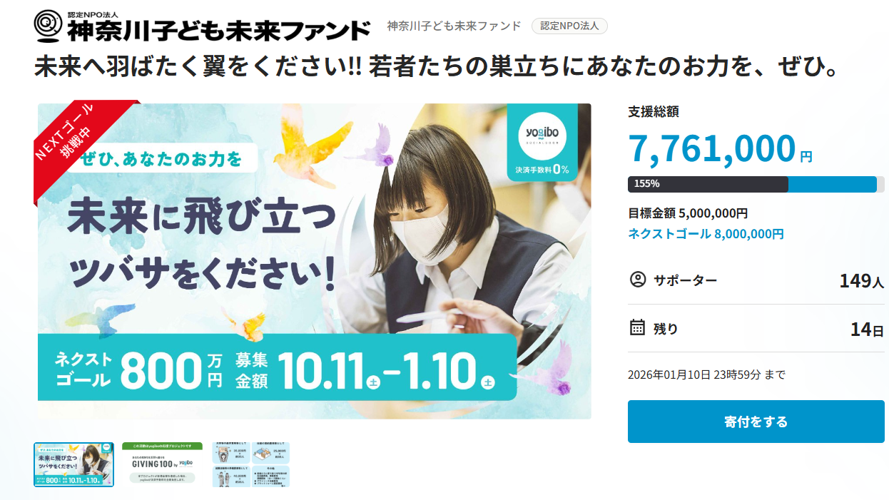 2025-12-09 14:01\目標500万円達成しました!ネクストゴール目指して頑張ります/かながわつばさプロジェクトへのあたたかい応援をどうもありがとうございます! 12/8に目標金額500万円を達成しました!これまでご支援いただきました皆さま、どうもありがとうございます。 皆さまがご支援額とともに届けてくださった想いの重みを改めて感じております。 このご支援により、一人でも多くの若者が未来を描いて羽ばたけるよう、協力団体の皆さまと一緒に心を若者たちのサポートを進めていきたいと思います。 まだまだクラファンは終わりません!この先来年・再来年とつばさプロジェクトを継続できるように、ネクストゴールを800万円に設定しました。 つばさプロジェクトを通して若者支援の輪が広がっていくよう、引き続き頑張ります!2025-12-09 14:01\目標500万円達成しました!ネクストゴール目指して頑張ります/かながわつばさプロジェクトへのあたたかい応援をどうもありがとうございます! 12/8に目標金額500万円を達成しました!これまでご支援いただきました皆さま、どうもありがとうございます。 皆さまがご支援額とともに届けてくださった想いの重みを改めて感じております。 このご支援により、一人でも多くの若者が未来を描いて羽ばたけるよう、協力団体の皆さまと一緒に心を若者たちのサポートを進めていきたいと思います。 まだまだクラファンは終わりません!この先来年・再来年とつばさプロジェクトを継続できるように、ネクストゴールを800万円に設定しました。 つばさプロジェクトを通して若者支援の輪が広がっていくよう、引き続き頑張ります!
