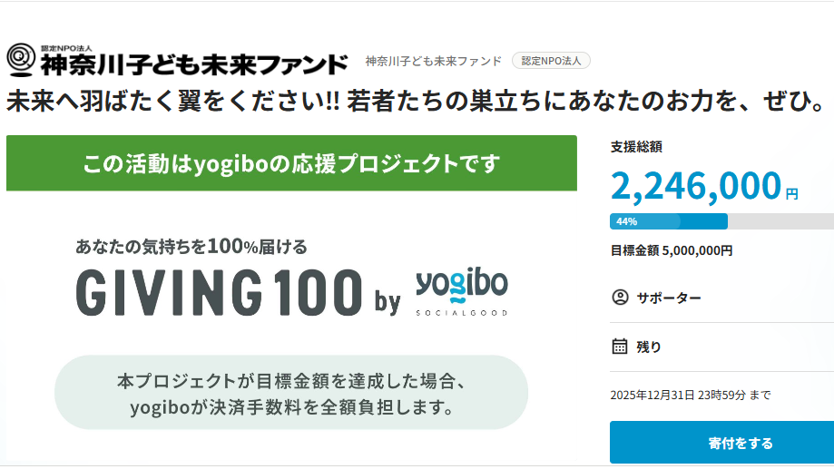 本プロジェクトは、2026年度から団体による自走化を前提として、神奈川県から補助を受けて実施してきました。自走化の資金を確保できない場合に、事業の継続が困難となります。若者たちの広げかけた希望の翼が折れないように、ぜひ、継続応援のご寄付を‼