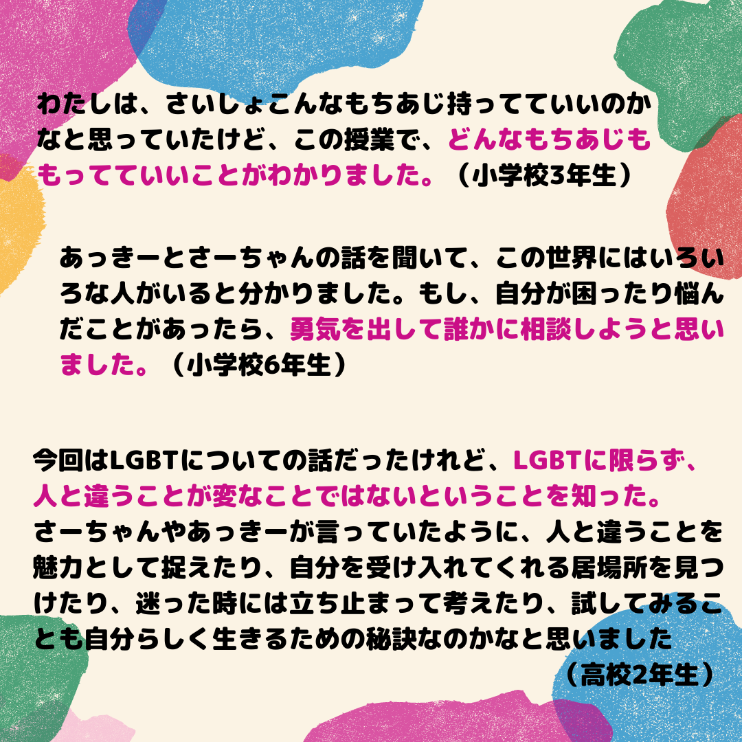 そして、私たちとともに「味方だよ」と伝える仲間の輪を広げ、自分の生きたい未来を生きる多様なロールモデルとの出逢いをつくることで、自分の未来に希望を持てる子どもたちが増えていくのではないか。
