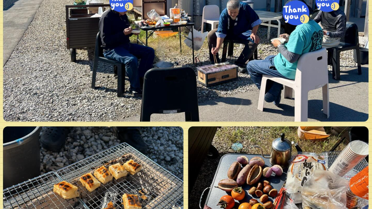 能登プレーパーク初日、七尾市の仮設住宅団地で開催させてもらいました😄 前日に、いしかわ子ども交流センター七尾館の山本館長から頂いたアケビや栗も持ってきて、七輪で餅を焼いているとお父さん方が出てきて沢山お話出来ました✨😊