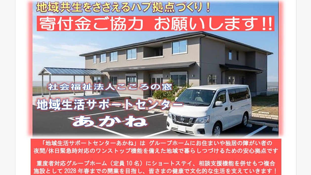 2025-08-15 00:00地域共生をささえる拠点建設を目指し活動を開始しました!【地域生活サポートセンターあかね創設へ向けて】社会福祉法人こころの窓は創立から四半世紀を迎えようとしています。福祉事業の参入・撤退が相次ぎ、介護人材も減少に転じるなか、持続可能な障がい福祉には、現実的で一貫した事業方針が不可欠です。当法人は、日中活動と暮らしの場を一体として整え、「家庭介護から社会介護へ」の移行を支えてきました。今回整備する重度者対応グループホーム・ショートステイ・相談支援を備えた地域生活サポートセンターあかねは、その象徴となる新たな一歩です。夜間・休日の緊急対応を一括で支える拠点づくりは、今後の事業の要となります。どうか温かいご支援をお願い申し上げます。2025-08-15 00:00地域共生をささえる拠点建設を目指し活動を開始しました!【地域生活サポートセンターあかね創設へ向けて】社会福祉法人こころの窓は創立から四半世紀を迎えようとしています。福祉事業の参入・撤退が相次ぎ、介護人材も減少に転じるなか、持続可能な障がい福祉には、現実的で一貫した事業方針が不可欠です。当法人は、日中活動と暮らしの場を一体として整え、「家庭介護から社会介護へ」の移行を支えてきました。今回整備する重度者対応グループホーム・ショートステイ・相談支援を備えた地域生活サポートセンターあかねは、その象徴となる新たな一歩です。夜間・休日の緊急対応を一括で支える拠点づくりは、今後の事業の要となります。どうか温かいご支援をお願い申し上げます。