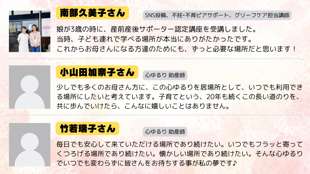 近年産後ケアの必要性が注目されつつありますが、まだまだその場所が少ない現状にあります。少しでも多くのお母さん方に、この心ゆるりを居場所として、いつでも利用できる場所にしたいと考えています。子育てという、20年も続くこの長い道のりを、共に歩んでいけたら、こんなに嬉しいことはありません。是非皆様のご協力、よろしくお願いいたします。