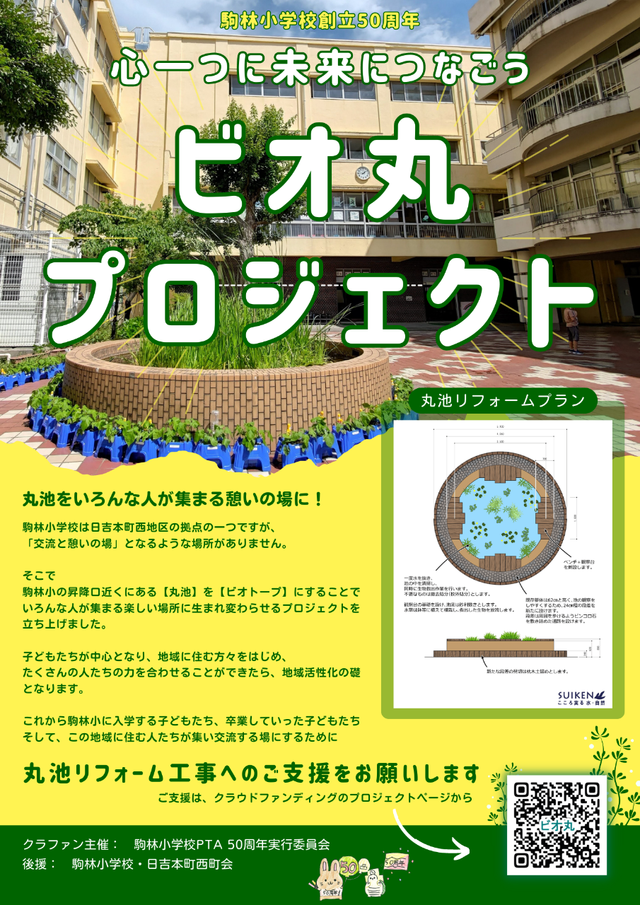 これから駒林小学校に入学する子どもたち、卒業していった子どもたち、そしてこの地域に住む人たちが集い交流する場所をつくるために、子どもたちも参加する丸池のビオトープ化工事へのご支援をお願いします。