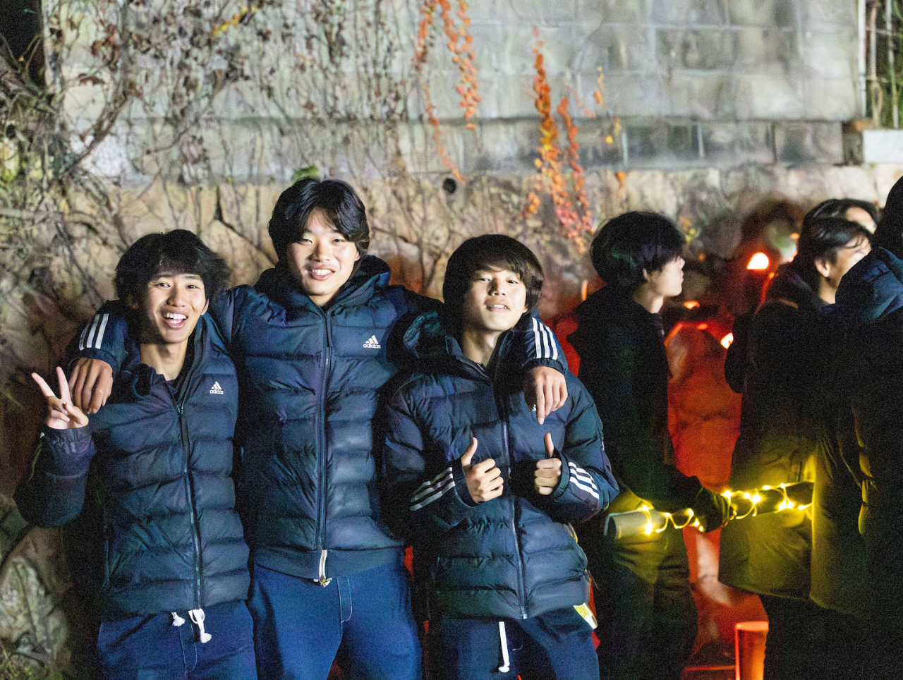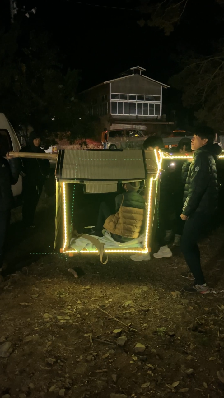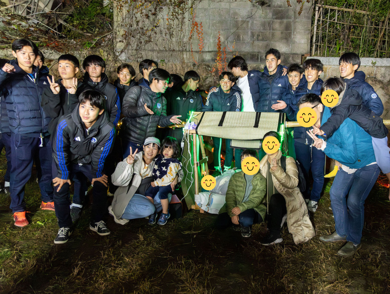 IPU(環太平洋大学)のサッカー部の皆さんがボランティアで光る駕籠を担いでくれて、竹灯籠の展示場所まで巡航してくれました。