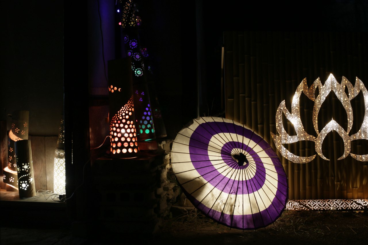 古民家入口前、蓮と和傘、イルミネーション竹灯籠のコラボ