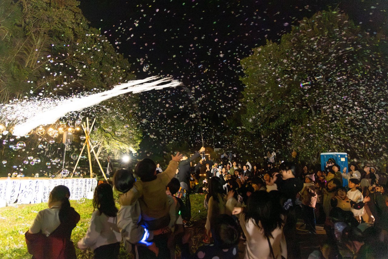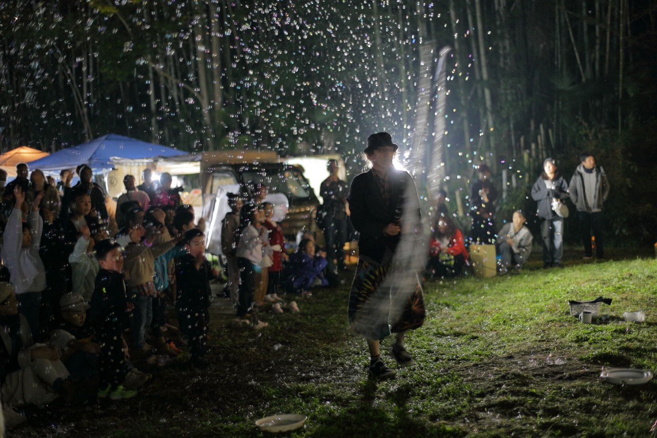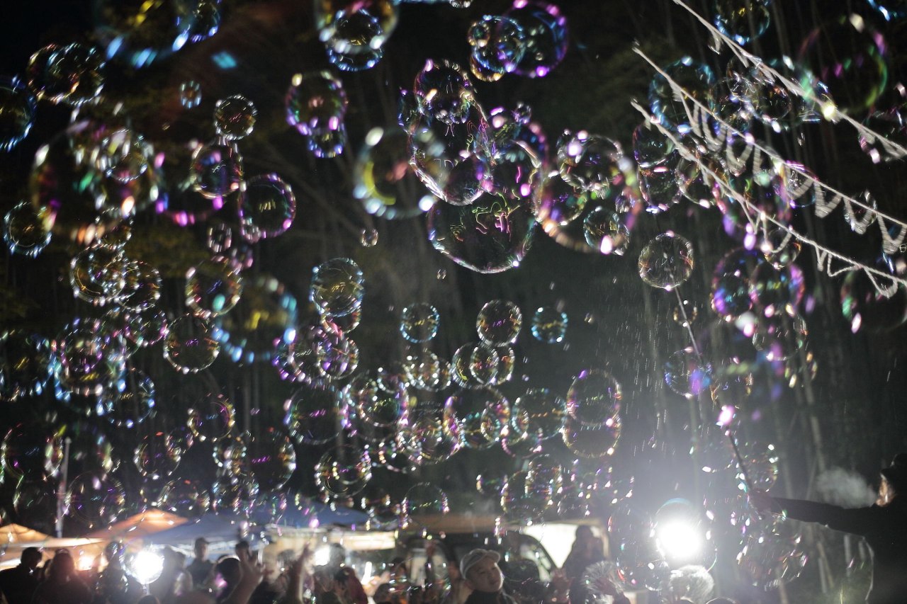 竹灯籠の灯りと夜空に煌めくシャボン玉、竹灯籠まつりのフィナーレを飾る催しにピッタリ。