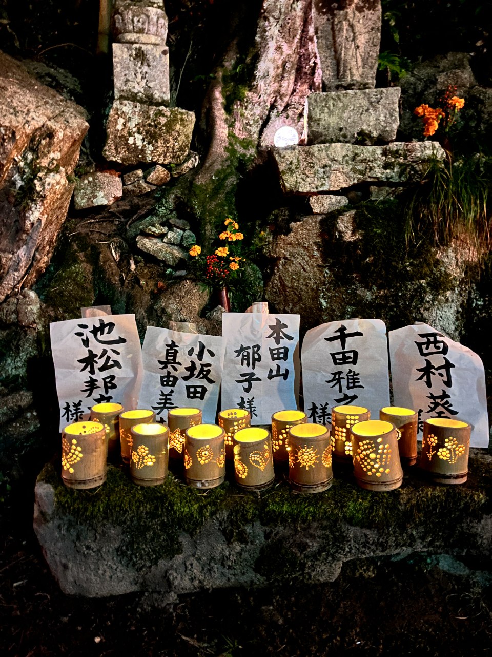 穂井田の近くにお住まいの玉島の竹灯籠作家、磯崎さんが自身の作品で演出していただきました。