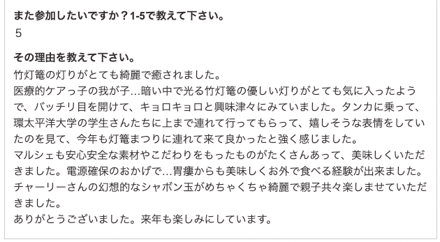 マルシェも安心安全な素材やこだわりをもったものがたくさんあって、美味しくいただきました。電源確保のおかげで…胃瘻からも美味しくお外で食べる経験が出来ました。