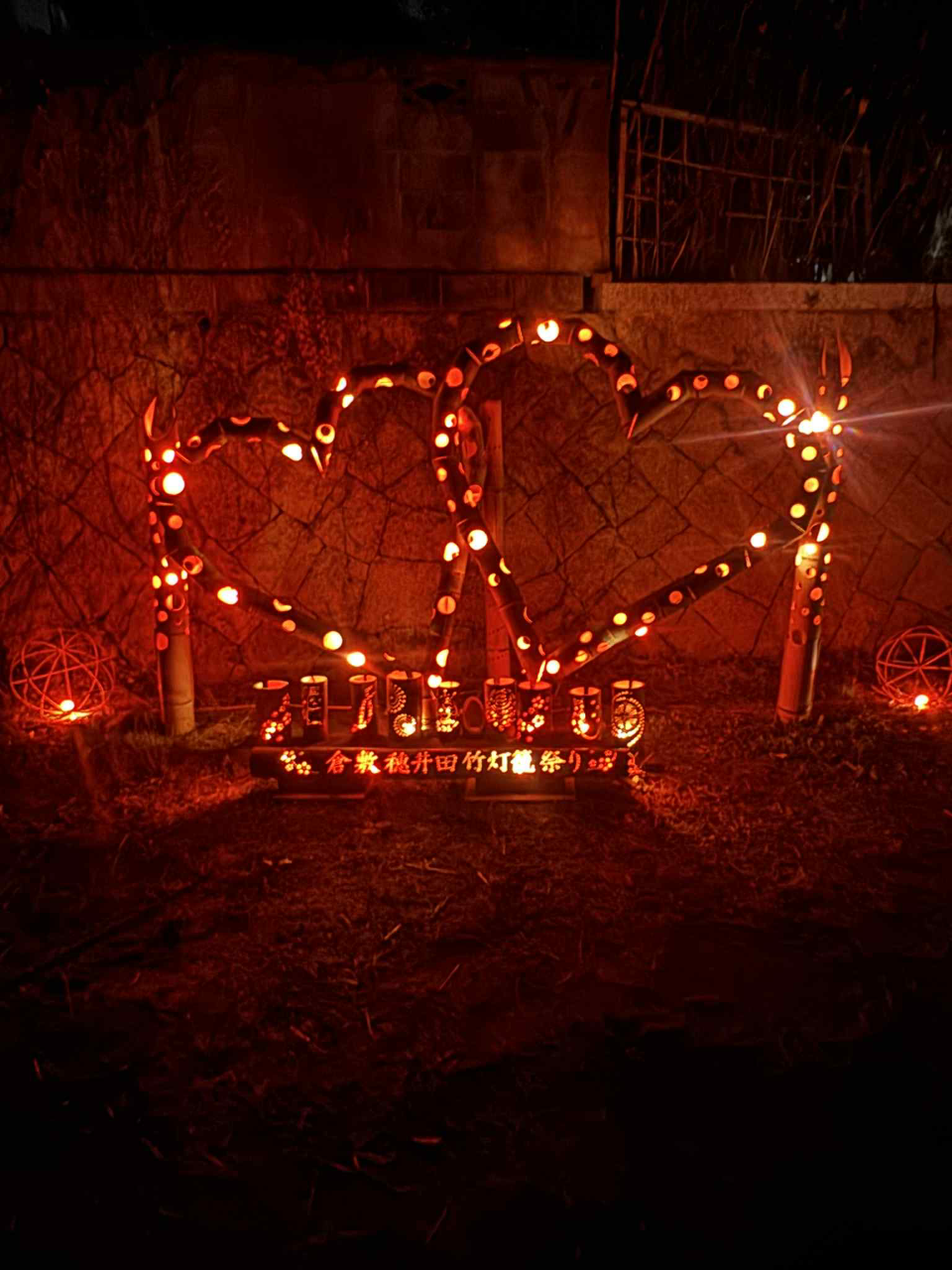 巨大なフォトフレームとハート型の竹灯籠作品は竹の社の出井さんの制作です。