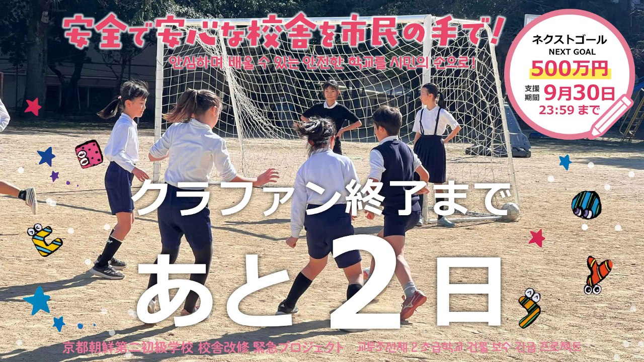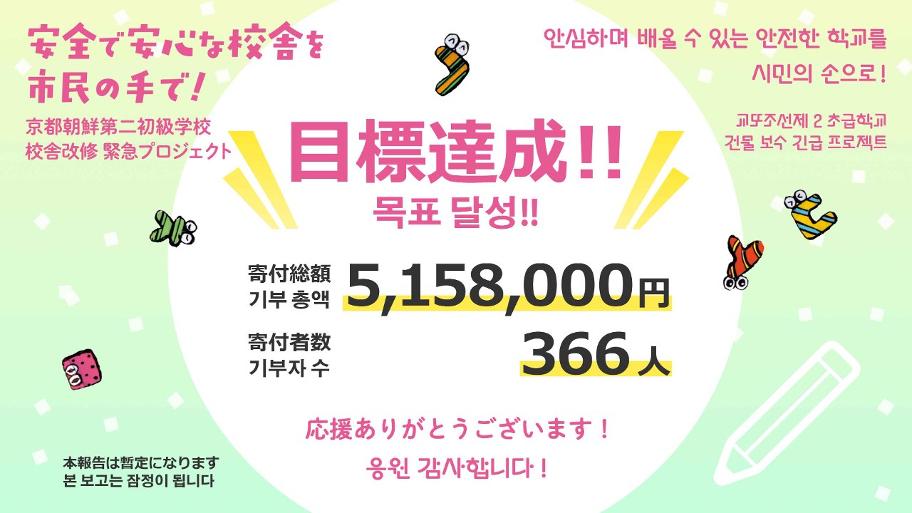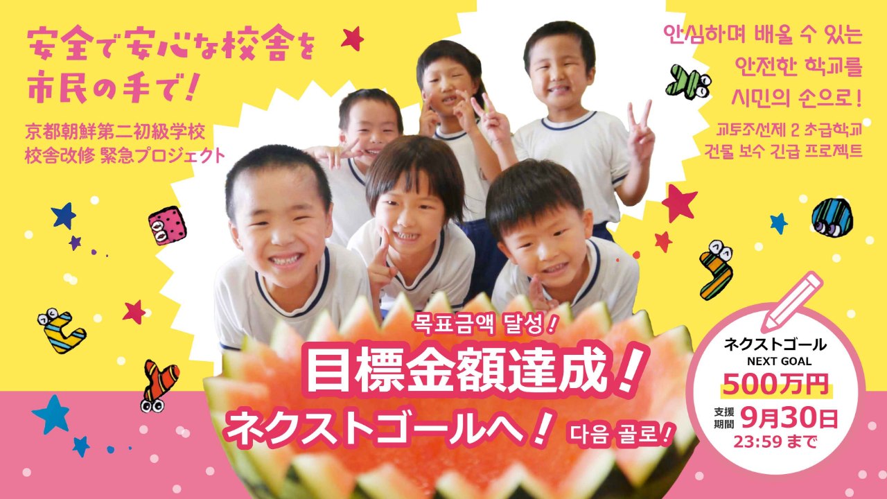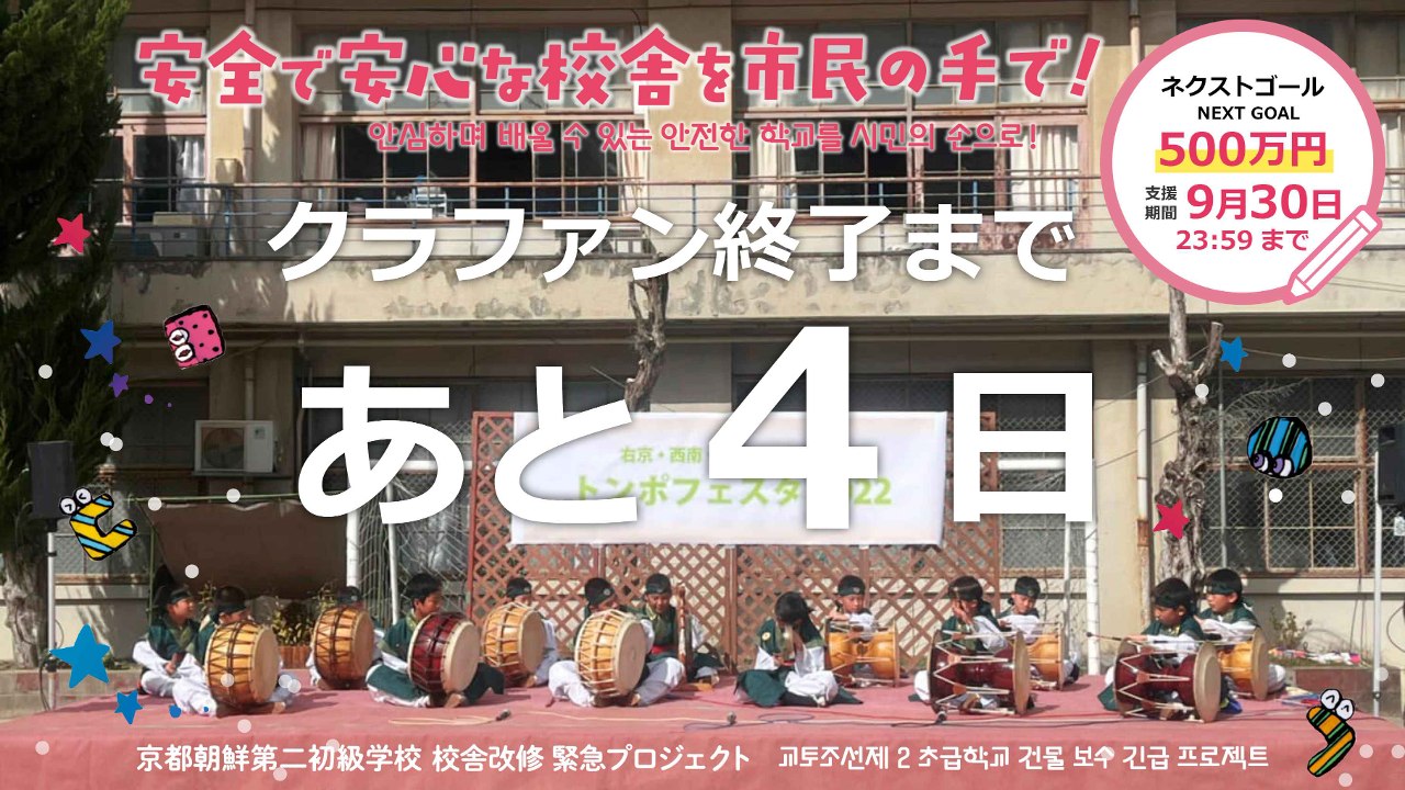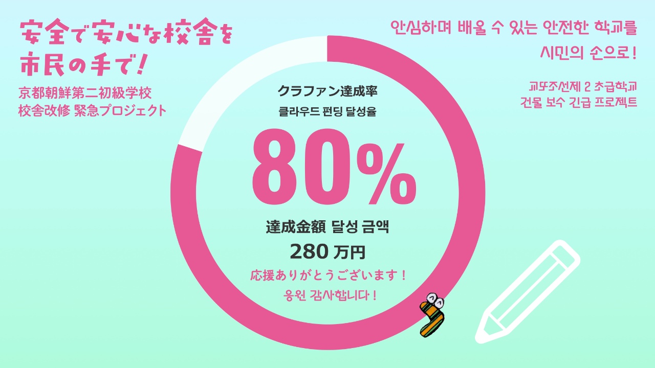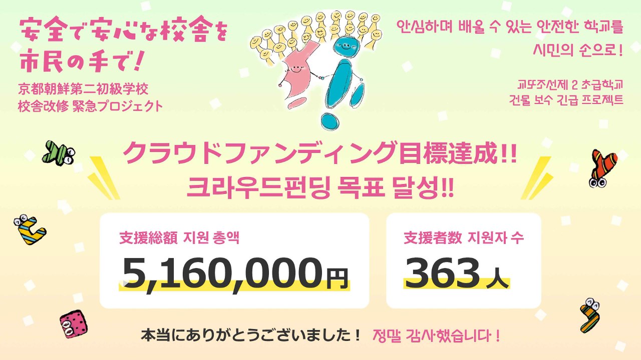 2024-10-02 12:12クラウドファンディング終了にあたっての目標達成のご報告とお礼(2024年10月2日)8月1日にスタートした京都朝鮮第二初級学校 校舎改修のためのクラウドファンディングが終了しました! たくさんのご支援とあたたかいメッセージをいただき、本当にありがとうございました。 暫定の寄付額・支援者を報告します。 크라우드펀딩을 종료하며 드리는 목표 달성 보고와 감사 인사 (2024년 10월 2일) 8월 1일에 시작한 교또조선제2초급학교 건물 보수를 위한 크라우드펀딩을 종료했습니다! 많은 분들께서 보내주신 지원과 따뜻한 메시지에 진심으로 감사드립니다. 잠정적인 기부액과 지원자에 대해 보고 드립니다.2024-10-02 12:12クラウドファンディング終了にあたっての目標達成のご報告とお礼(2024年10月2日)8月1日にスタートした京都朝鮮第二初級学校 校舎改修のためのクラウドファンディングが終了しました! たくさんのご支援とあたたかいメッセージをいただき、本当にありがとうございました。 暫定の寄付額・支援者を報告します。 크라우드펀딩을 종료하며 드리는 목표 달성 보고와 감사 인사 (2024년 10월 2일) 8월 1일에 시작한 교또조선제2초급학교 건물 보수를 위한 크라우드펀딩을 종료했습니다! 많은 분들께서 보내주신 지원과 따뜻한 메시지에 진심으로 감사드립니다. 잠정적인 기부액과 지원자에 대해 보고 드립니다.