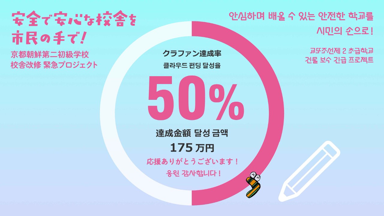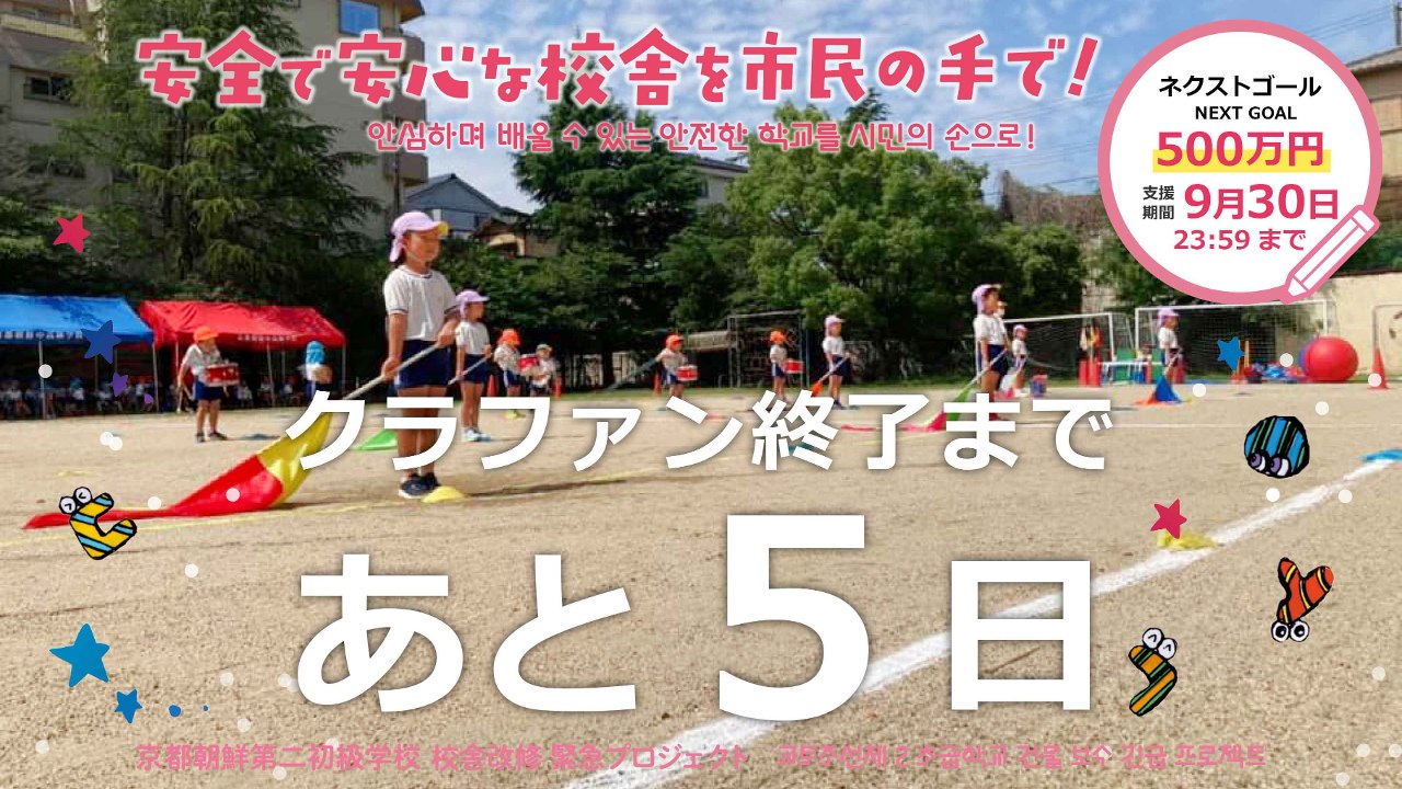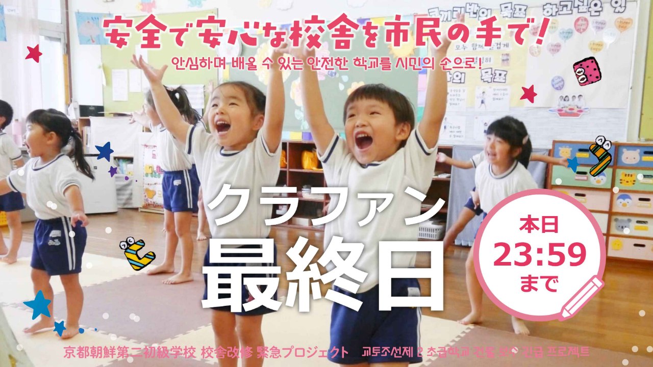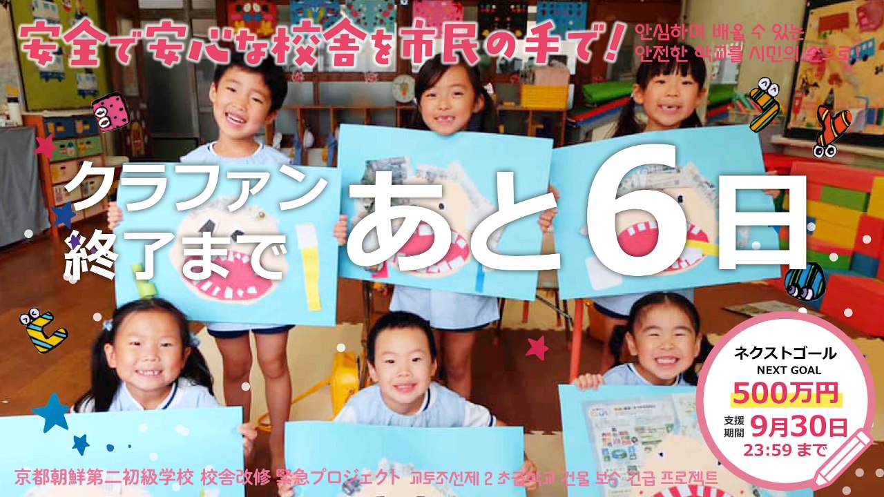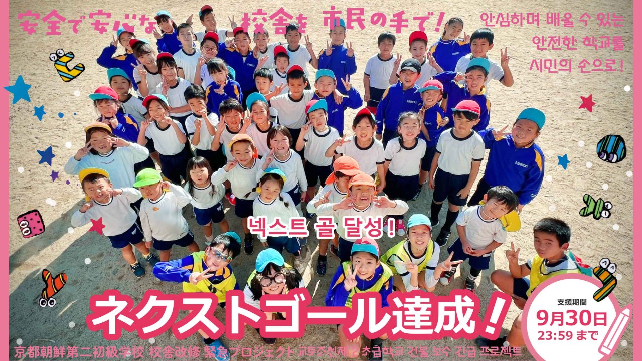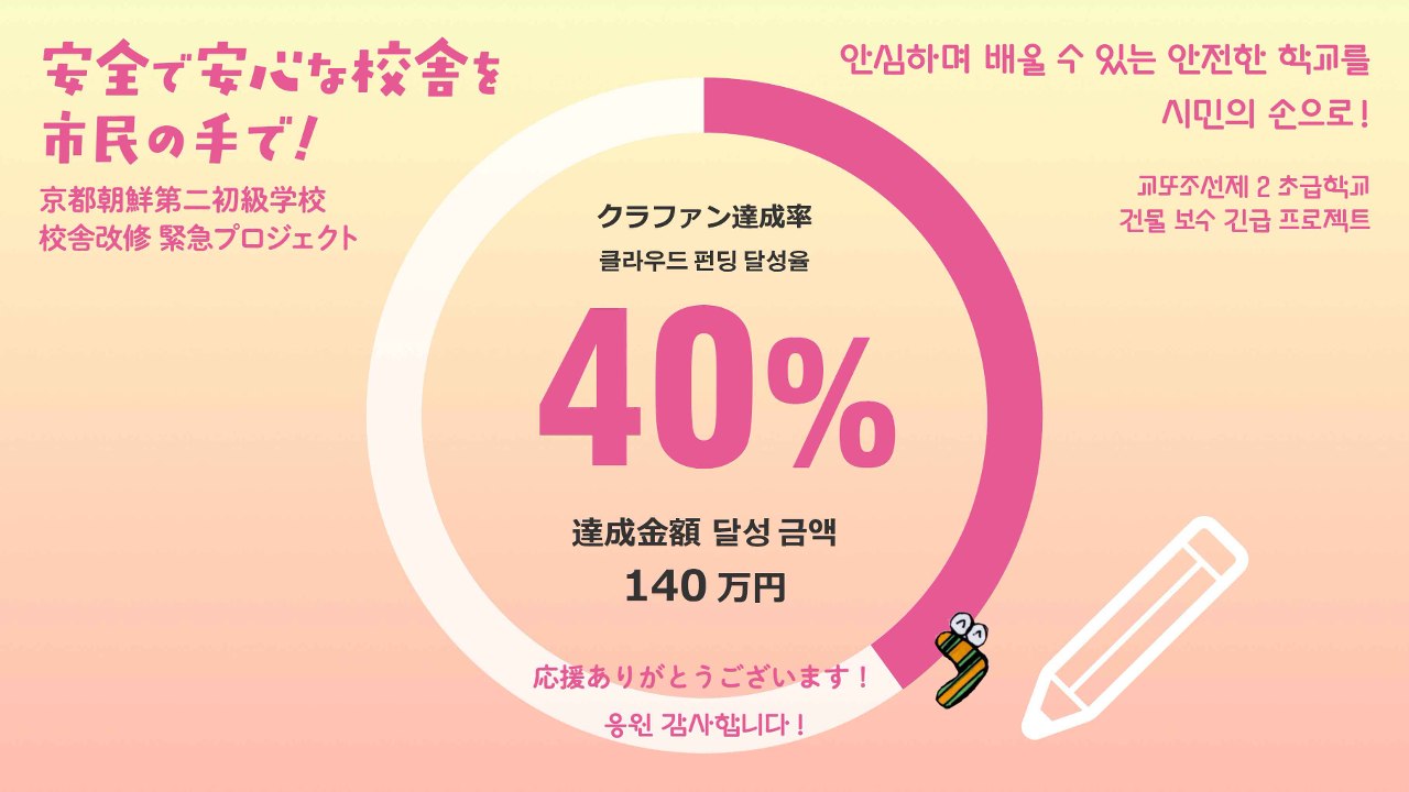 2024-10-02 12:12クラウドファンディング終了にあたっての目標達成のご報告とお礼(2024年10月2日)8月1日にスタートした京都朝鮮第二初級学校 校舎改修のためのクラウドファンディングが終了しました! たくさんのご支援とあたたかいメッセージをいただき、本当にありがとうございました。 暫定の寄付額・支援者を報告します。 크라우드펀딩을 종료하며 드리는 목표 달성 보고와 감사 인사 (2024년 10월 2일) 8월 1일에 시작한 교또조선제2초급학교 건물 보수를 위한 크라우드펀딩을 종료했습니다! 많은 분들께서 보내주신 지원과 따뜻한 메시지에 진심으로 감사드립니다. 잠정적인 기부액과 지원자에 대해 보고 드립니다.2024-10-02 12:12クラウドファンディング終了にあたっての目標達成のご報告とお礼(2024年10月2日)8月1日にスタートした京都朝鮮第二初級学校 校舎改修のためのクラウドファンディングが終了しました! たくさんのご支援とあたたかいメッセージをいただき、本当にありがとうございました。 暫定の寄付額・支援者を報告します。 크라우드펀딩을 종료하며 드리는 목표 달성 보고와 감사 인사 (2024년 10월 2일) 8월 1일에 시작한 교또조선제2초급학교 건물 보수를 위한 크라우드펀딩을 종료했습니다! 많은 분들께서 보내주신 지원과 따뜻한 메시지에 진심으로 감사드립니다. 잠정적인 기부액과 지원자에 대해 보고 드립니다.