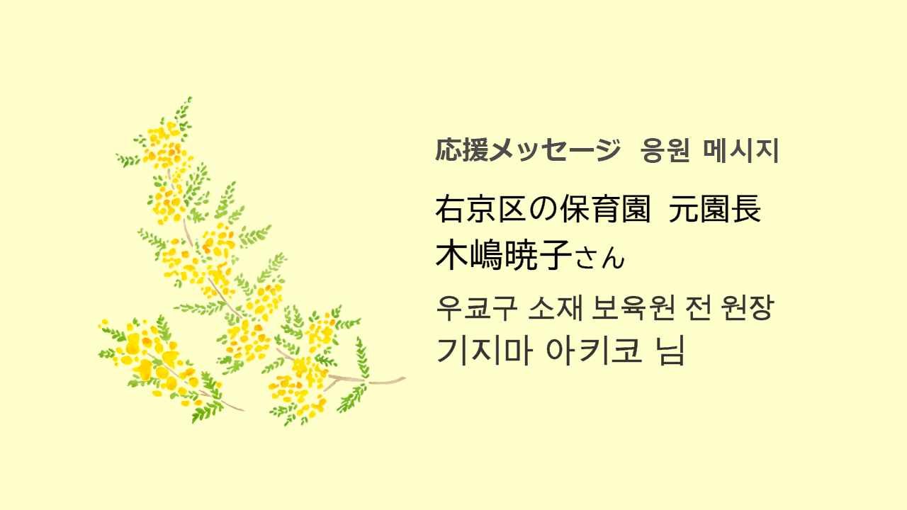 2024-09-29 01:35かわいく素敵な子どもたちのために、より良い教育環境を! 右京区の保育園 元園長 木嶋暁子さん50年以上右京区で生活していますが、京都朝鮮第二初級学校のことは何も知りませんでした。 が、退職後、長年勤めた職場のつながりで学校見学の機会に恵まれました。 短い時間でしたが、一人ひとりの子どもたちに寄り添い、丁寧な保育(教育)が行き届いているなと感じました。 かわいく素敵な子どもたちのために、より良い教育環境を!応援しています。 우쿄구 소재 보육원 전 원장 기지마 아키코 님 50년을 넘게 우쿄구(학교소재지)에서 살았지만 교또조선제2초급학교에 대해서는 아무것도 몰랐습니다. 퇴직 후 오랜 세월 근무했던 직장 관계로 학교를 견학할 기회를 얻었습니다. 짧은 시간이었지만 아이들 한 명 한 명 옆에서 보살피는 정성스러운 보육(교육)이 잘 되어 있다고 느꼈습니다. 귀엽고 멋진 아이들을 위해 더 나은 교육환경을! 응원합니다.2024-09-29 01:35かわいく素敵な子どもたちのために、より良い教育環境を! 右京区の保育園 元園長 木嶋暁子さん50年以上右京区で生活していますが、京都朝鮮第二初級学校のことは何も知りませんでした。 が、退職後、長年勤めた職場のつながりで学校見学の機会に恵まれました。 短い時間でしたが、一人ひとりの子どもたちに寄り添い、丁寧な保育(教育)が行き届いているなと感じました。 かわいく素敵な子どもたちのために、より良い教育環境を!応援しています。 우쿄구 소재 보육원 전 원장 기지마 아키코 님 50년을 넘게 우쿄구(학교소재지)에서 살았지만 교또조선제2초급학교에 대해서는 아무것도 몰랐습니다. 퇴직 후 오랜 세월 근무했던 직장 관계로 학교를 견학할 기회를 얻었습니다. 짧은 시간이었지만 아이들 한 명 한 명 옆에서 보살피는 정성스러운 보육(교육)이 잘 되어 있다고 느꼈습니다. 귀엽고 멋진 아이들을 위해 더 나은 교육환경을! 응원합니다.