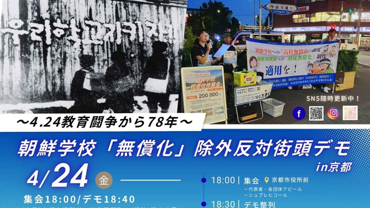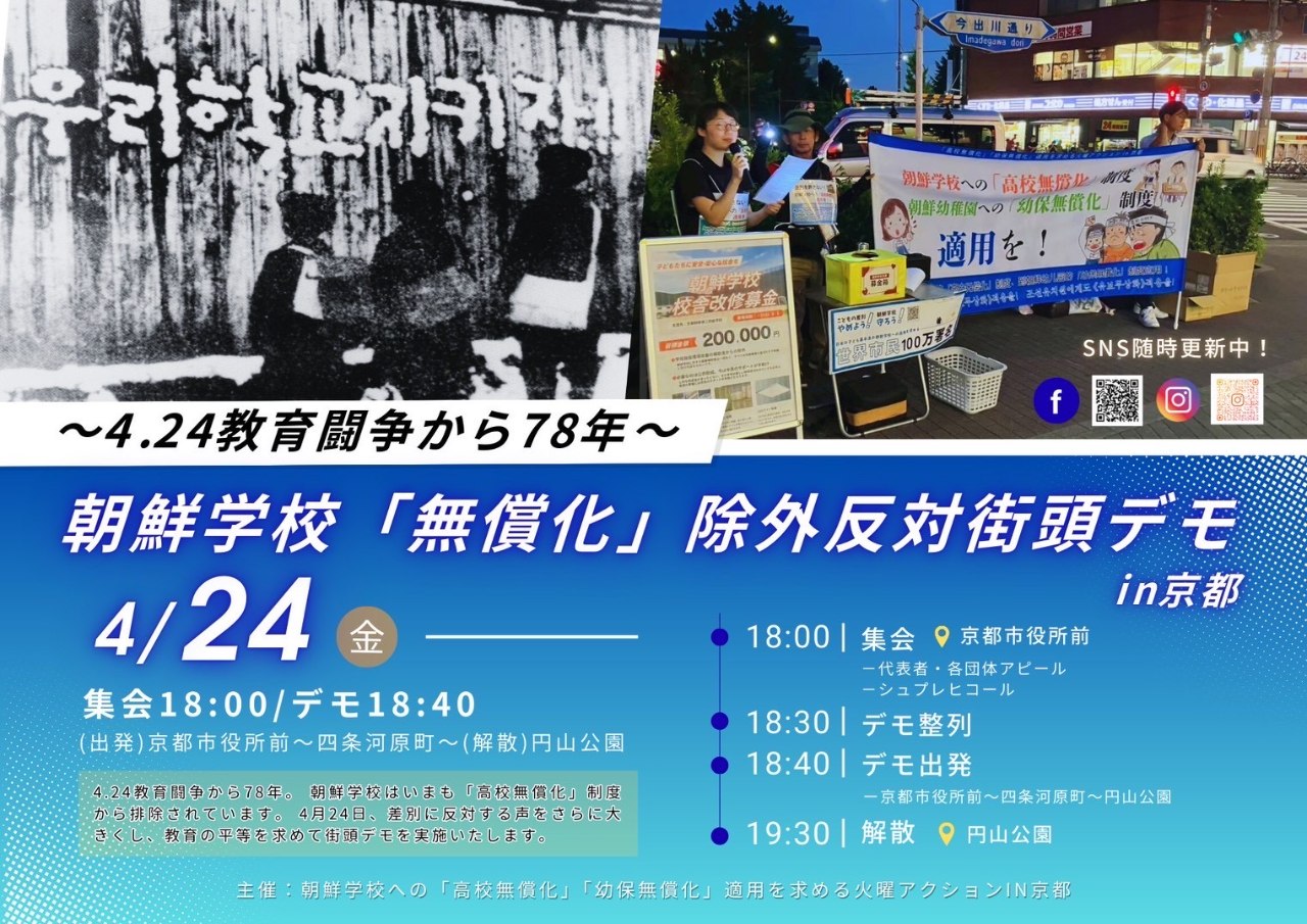 4月24日(金)、教育闘争から78目の日に、朝鮮学校差別に反対する声をさらに大きくするため、街頭デモを実施します。