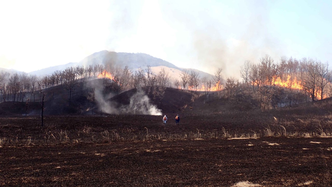 「くじゅうの春は黒」と昔から謳われているように、くじゅうでは昔から草原を守るために野焼きを行ってきました。今年は3月10日に飯田高原の大将軍・やまなみハイウェイで、3月31日に泉水山とタデ原湿原で野焼きが行われました。野焼きは地元住民やボランティア、関係団体や消防団など100名ほどの協力のもと行われます。くじゅうファンクラブでは消火道具の貸し出しや飲料の提供(総勢約300名分)などを通して、地域の野焼き活動を支援しています。