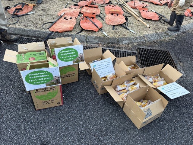 くじゅうファンクラブの活動として、タデ原・大将軍の野焼き活動に参加してくだった関係団体・ボランティアスタッフのみなさまへ飲料・食料を提供させていただきました!これはくじゅうファンクラブのみなさまからのご支援や、伊藤園さまから「お~い!お茶」のご提供をいただいたことでお届けすることができました。また、今年度は消火道具のひとつである背負い式水のう(別名:ジェットシューター)を4機購入し、野焼き活動を支援させていただきました。