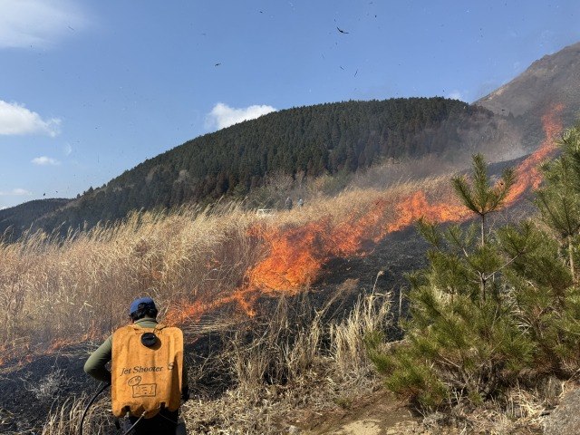 くじゅうに野焼きのシーズンがやってきました!3月1日には久住高原の沢水(そうみ)で、9日はタデ原湿原と飯田高原の大将軍で野焼きが行われました。草原の美しい景観や草原に生育・生息する動植物のすみかを守るために続けられている野焼きは、くじゅうの春の風物詩です。パチパチと草が燃える音とともに人の背丈より高く立ち上る炎、そして見る見るうちに大地が黒に染まっていく光景は何度見ても圧倒されます。野焼き実行委員会を中心に、地元住民や関係団体・ボランティアなど大勢の人々によって野焼きが無事行われました。