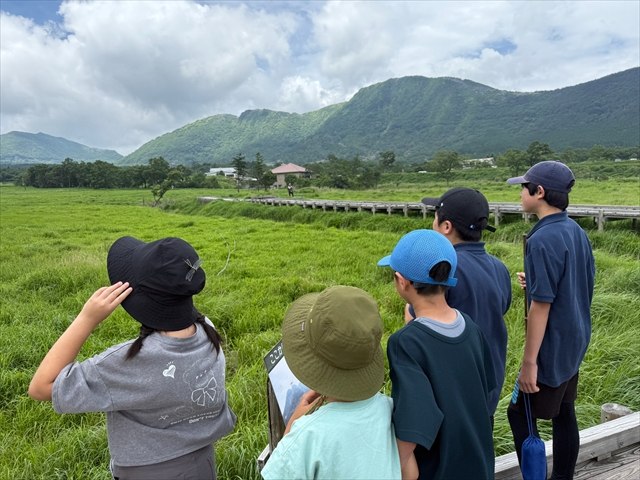 午後は牧ノ戸峠展望台へ登り、タデ原湿原を見下ろしながら、長者原周辺の飯田高原が、今と昔でどのように様子が変化しているか、写真を見比べながら話を聞きました。子どもたちからは「初めて登って楽しかった!」「この広さを野焼きするのは大変そう」「森になっているところが少し増えてる」などの感想があり、これからどのようにタデ原湿原を守っていくべきか考えるきっかけとなりました。くじゅうファンクラブでは子どもたちへの環境教育を通して、くじゅう地区の環境を守る活動に取り組んでいます。