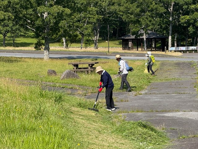 7月8日に、地元の九重・飯田高原観光協会やボランティアのみなさんから成る「公私隊」による環境整備活動が行われました。今回は長者原周辺と川端康成文学碑周りの草刈り・牧ノ戸峠~長者原までの九州自然歩道間での草刈りと泥上げの作業です。長者原地区は、夏に向けて一般の観光客やツアー団体・登山客など多くのお客様で賑わいます。訪れる方々が気持ちよく且つ安全に施設や場所の利用ができるよう、30名を超えるメンバーで作業に取り組みました。伸びきった草を刈り取ったり、積みあがった朽葉・泥を除去したことで、歩道や芝生広場が見違えるほどきれいになりました。梅雨の晴れ間で暑い中での作業となりましたが、達成感の大きい整備活動となりました。作業された皆さま、大変お疲れ様でした!