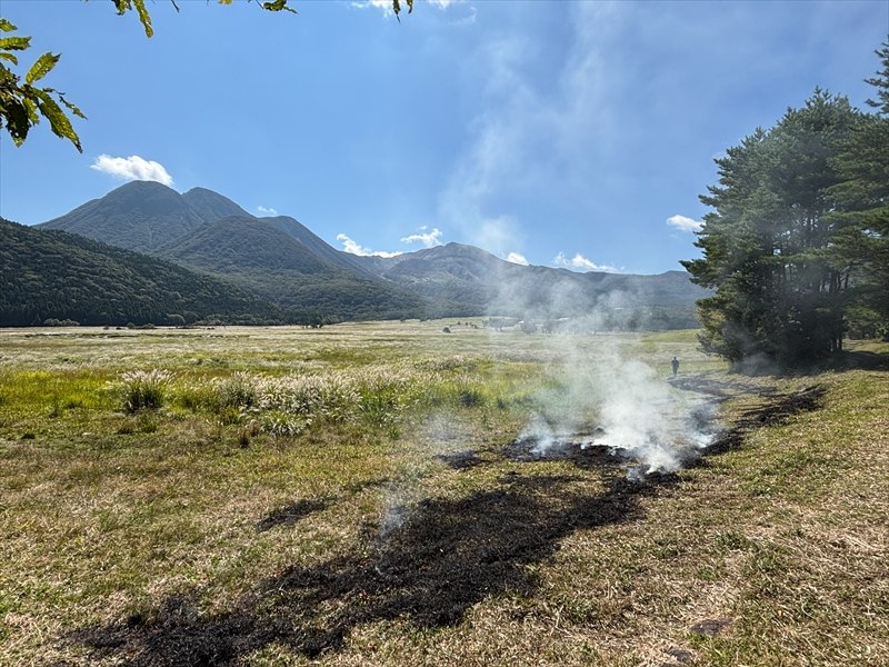 飯田高原の野焼きの準備が着々と進められています。10月9日、地元の九重・飯田高原観光協会やボランティアのみなさんから成る「公私隊」によるタデ原湿原の木道沿い以外の防火線焼き作業が行われました。これは、野焼きの本焼きでの延焼を防ぐための防火帯づくりの作業で、夏に草を刈ったラインを焼くことで防火帯が完成します!火付け役と消火役のそれぞれの役割を果たしながら、来年の春安全に野焼きが行われるために、多くの方の協力のもと作業が行われました。