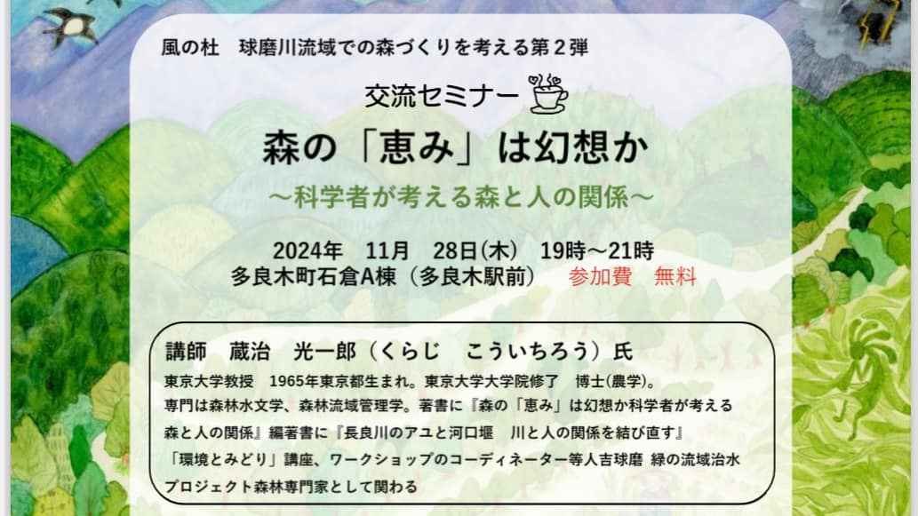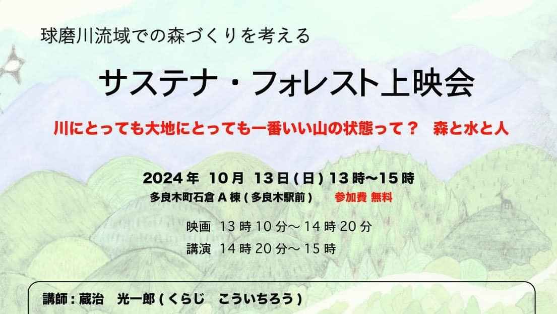2024-10-04 15:00球磨川流域での森づくりを考える勉強会(10/13)のご案内実行団体の【風の杜人】が、球磨川流域での森づくりを考える勉強会(サステナ・フォレスト上映会と現地観察会)を開催されます。ぜひお誘いあわせの上ご参加いただければ幸いです。 2024年 10月 13日(日)13時〜15時 会場 多良木町石倉A棟(多良木駅前) 費用 無料 映画 13時10分~14時20分 講演 14時20分~15時00分 講師 蔵治光一郎/東京大学教授、森林水文学、森林流域管理学専門。 ★講演会終了後「風の杜」現地での藏治先生による観察会を行います。 参加申込・お問い合わせ] 風の杜Facebook、メッセンジャーにて連絡 主催:風の杜人 協賛:鎮山親水 千年の森づくりクラブ 助成:一般財団法人くまもとSDGs推進財団2024-10-04 15:00球磨川流域での森づくりを考える勉強会(10/13)のご案内実行団体の【風の杜人】が、球磨川流域での森づくりを考える勉強会(サステナ・フォレスト上映会と現地観察会)を開催されます。ぜひお誘いあわせの上ご参加いただければ幸いです。 2024年 10月 13日(日)13時〜15時 会場 多良木町石倉A棟(多良木駅前) 費用 無料 映画 13時10分~14時20分 講演 14時20分~15時00分 講師 蔵治光一郎/東京大学教授、森林水文学、森林流域管理学専門。 ★講演会終了後「風の杜」現地での藏治先生による観察会を行います。 参加申込・お問い合わせ] 風の杜Facebook、メッセンジャーにて連絡 主催:風の杜人 協賛:鎮山親水 千年の森づくりクラブ 助成:一般財団法人くまもとSDGs推進財団