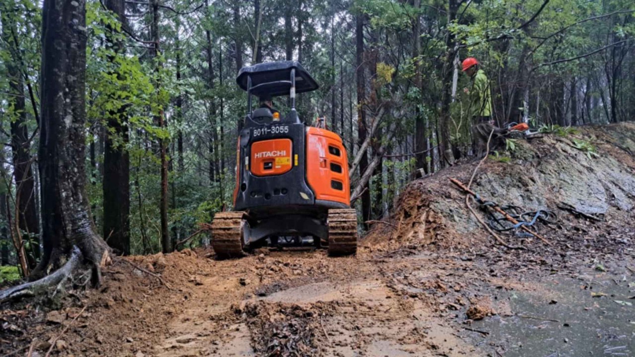 雨の中では重機のキャタピラが滑る可能性があり、橋本先生の山ではリスクを考えて作業はしないというのに、道の入り口だけでもと、自伐型林業の普及を熊本でも推進するため、ご指導いただいています。