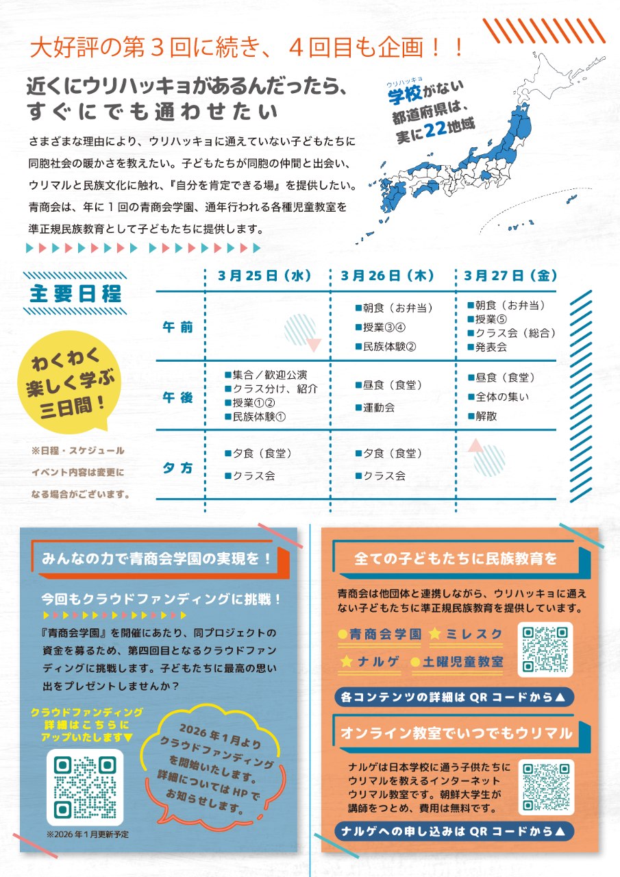 その一環として学校がない地域の『コッポンオリ』たちにも『ウリハッキョ』に通う機会を提供するプロジェクトとして『青商会学園』を開催することにしました。同プロジェクトの資金を募るため、第三回目となるクラウドファンディングに挑戦します。