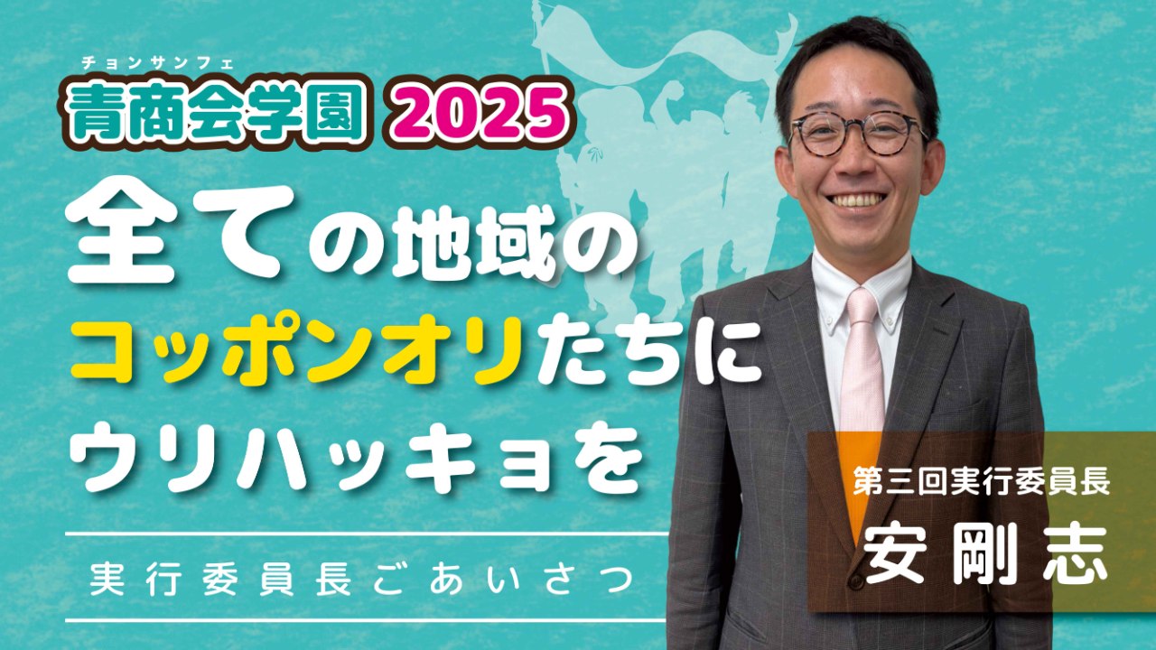 2024-12-26 12:04応援メッセージ(岡山会長、中央民族教育支援部長 安剛志)グローバル化が進む現状において、在日コリアンの子どもたちは日本と朝鮮・韓国を繋ぐ架け橋となり世界に羽ばたいていける貴重な存在であり、我々の宝です。 子どもたちが、どこにいたとしても『自分が一人でないという事』、『同じ想いをもつチング(仲間)がいるという事』を思い出せる。 そうした事を子どもたちに与えられる3日間となると確信しています。 このような素晴らしい企画を継続・発展させて行く上で、全国からのご支援を賜りたいとクラウドファンデングも過去に引き続き挑戦しております。 我々の未来であり宝であるウリ学生達の笑顔を守り続けられるよう、届けられる全てのご支援・ご関心を胸に、全力で『青商会学園』に取り掛かります。 本プロジェクトへの皆様からの多大なる応援をよろしくお願い致します。 参加される皆さん!みんなの笑顔を茨城でみられることを楽しみにしています。2024-12-26 12:04応援メッセージ(岡山会長、中央民族教育支援部長 安剛志)グローバル化が進む現状において、在日コリアンの子どもたちは日本と朝鮮・韓国を繋ぐ架け橋となり世界に羽ばたいていける貴重な存在であり、我々の宝です。 子どもたちが、どこにいたとしても『自分が一人でないという事』、『同じ想いをもつチング(仲間)がいるという事』を思い出せる。 そうした事を子どもたちに与えられる3日間となると確信しています。 このような素晴らしい企画を継続・発展させて行く上で、全国からのご支援を賜りたいとクラウドファンデングも過去に引き続き挑戦しております。 我々の未来であり宝であるウリ学生達の笑顔を守り続けられるよう、届けられる全てのご支援・ご関心を胸に、全力で『青商会学園』に取り掛かります。 本プロジェクトへの皆様からの多大なる応援をよろしくお願い致します。 参加される皆さん!みんなの笑顔を茨城でみられることを楽しみにしています。