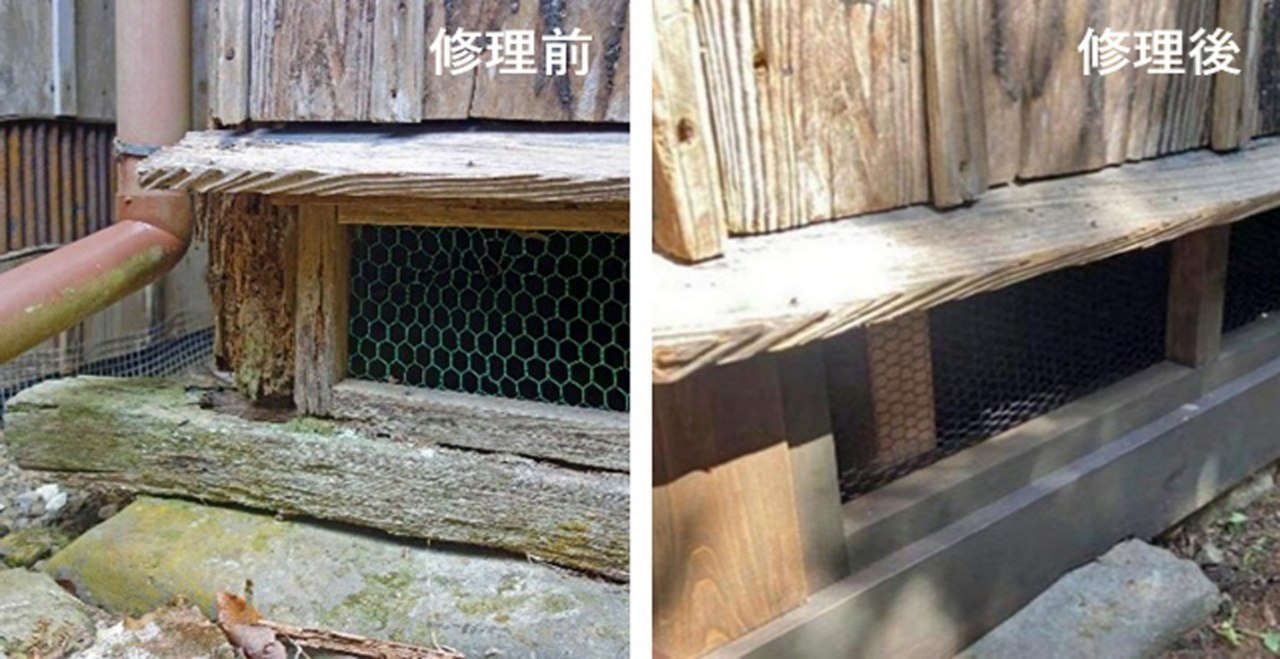 このたびの修理では、柱を持ち上げて根継ぎし、地覆を取り替え、あわせて排水環境の改善も目指しました。