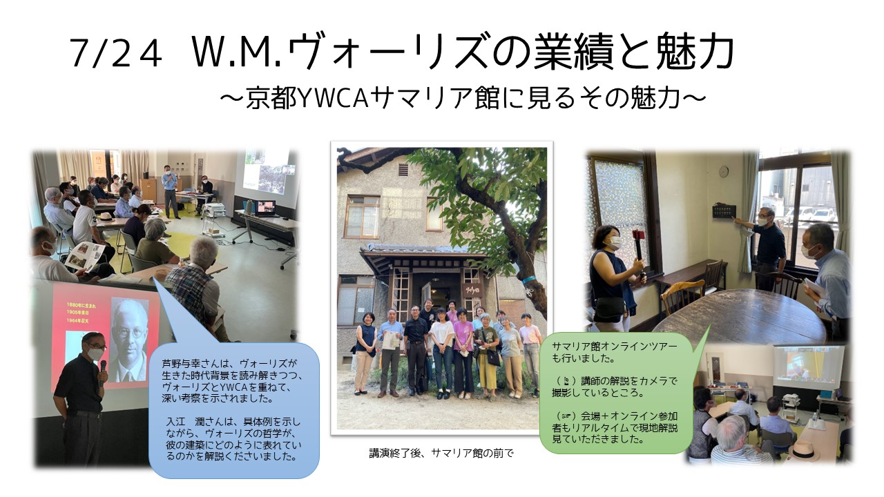 7月24日夏らしい青空が広がる日曜日に、株式会社一粒社ヴォーリズ建築事務所顧問の芹野与幸さん、同社一級建築士の入江潤さんをお招きして、「W.M.ヴォーリズの業績と建築~京都YWCAサマリア館に見るその魅力~」と題し、ハイブリッド講演会を行いました。歴史的背景からヴォーリズの思想、そしてそれがどのように彼の建築に具現化されているかを読み解く内容に、好奇心が思い切り刺激されました。ヴォーリズとYWCAの浅からぬ関わりも知り、私たちに「サマリア館」が与えられた幸せを想いました。きれいにしてあげたいです!★「続きを読む」ボタンを押すと当日の様子がご覧いただけます。