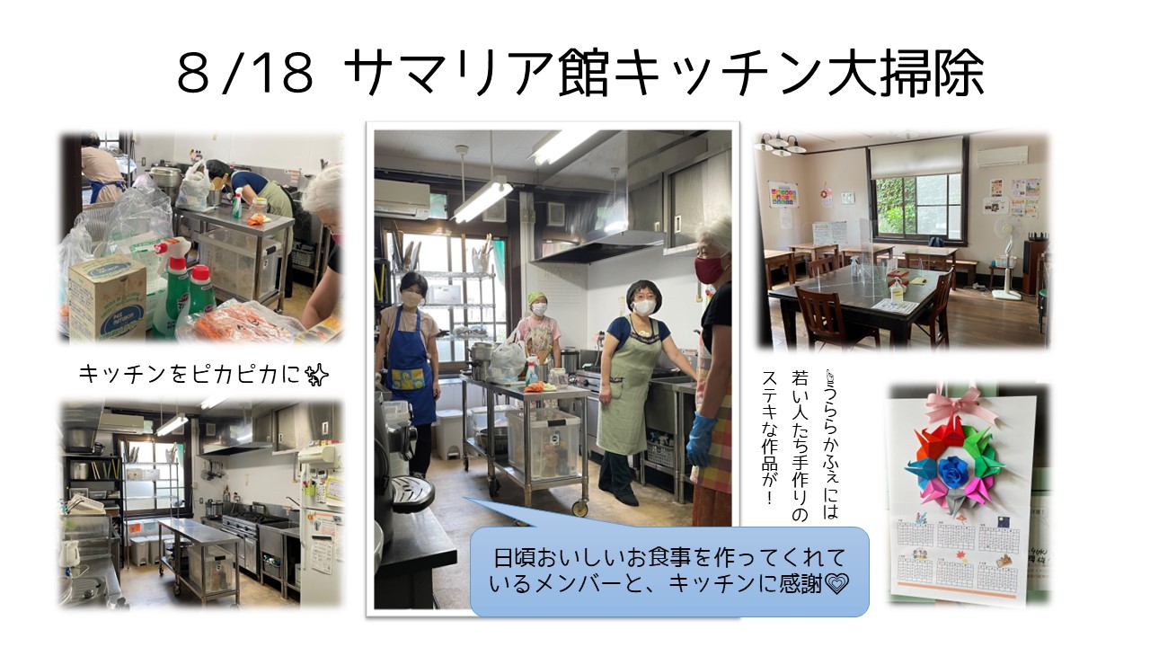 夏期休館が終了して間もない8月18日、サマリア館「うららかふぇ」のキッチンスタッフが、キッチンの大掃除に汗を流していました。「うららかふぇ」のキッチンは、それほど広くはありませんが、サマリア館改装の折に設備や道具を会員たちで検討しながら作ったものです。「かふぇ」の運営は順風満帆とはいきませんが、ここが「食」を通じていろいろな人たちの出会いの場、誰もが自分らしくいられる居場所になるように、みんなが願ってキッチンに立っています。掃除が終わってピカピカになったキッチン。明日からまたおいしいものが生まれます。★「続きを読む」ボタンで様子をご覧いただけます。