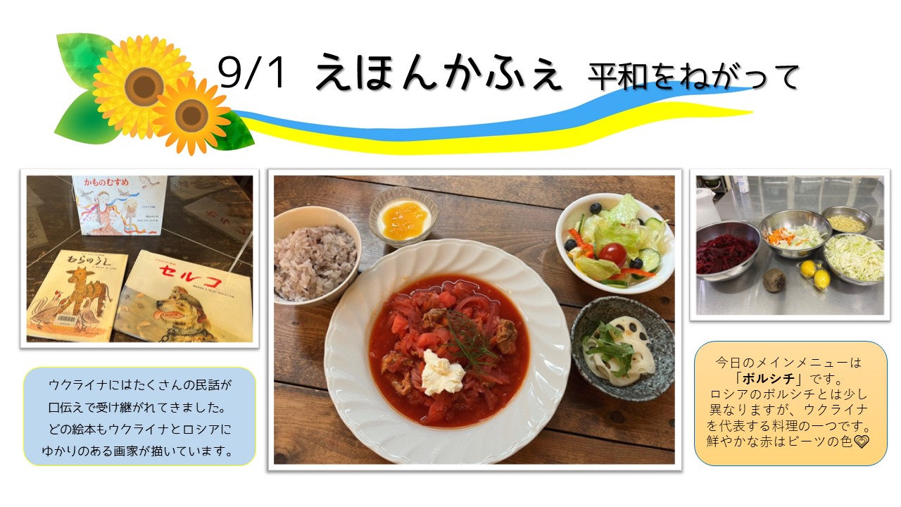 「ボルシチ」の色鮮やかな赤色はビーツ(サトウダイコンの一種)によるもの。手を真っ赤にして料理していたスタッフから「ボルシチは時間が経つとオレンジ色になったよ」と聞きました。「ボルシチ」を食べた皆さんが笑顔になったのは、不思議な野菜ビーツの魔法かな??? ★「えほんかふぇ」の様子は「続きを読む」ボタンを押してくださいね。
