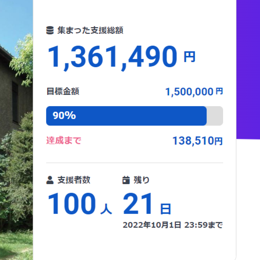 100人の方のご支援で目標90%に!