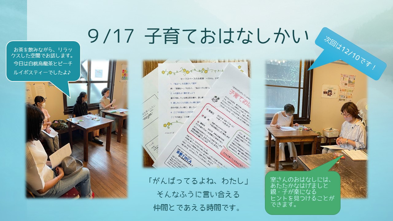 京都YWCAには今年で16年目となる「言葉や発達に心配のある子どもを持つ『おやのだんわしつ』」という活動があります。その活動をベースに「子どもを育てている人」の居場所としてお話会を行っています。グループには深い悩みを抱えた方もいましたが、想いを言葉で伝えられ、成人した子がいる方が力強く経験談で応答されました。「経験を共有し共感や寄り添いを得て安心できる場」を参加している人たちが創り出していたことが印象的でした。第2回目の「子育ておはなしかい」は12月10日(土)13:00~です。★「続きを読む」ボタンで様子を見られます。