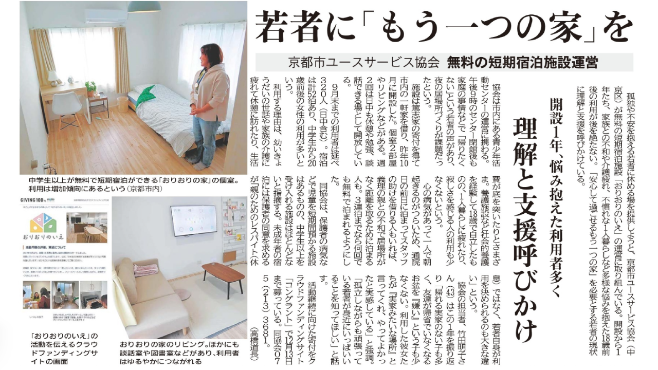 “孤独や不安を抱える若者に休める場所を提供しようと、京都市ユースサービス協会(中京区)が無料の短期宿泊施設「おりおりのいえ」の運営に取り組んでいる”