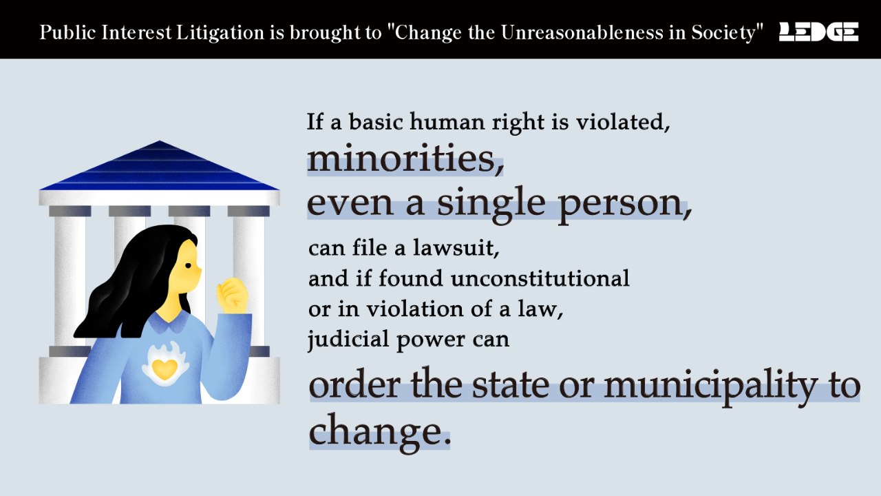 We define public interest litigation as lawsuits against the state and municipalities aimed at resolving social issues. Various unreasonable things in society are tried in court for their constitutionality and the need for rectification. If and when the court rules in our favor, the judicial power gives an order to the state and/or municipality to rectify that unreasonableness. Unlike legislation or the administration where majority rules, the judiciary allows for even minorities’ voices to be heard.