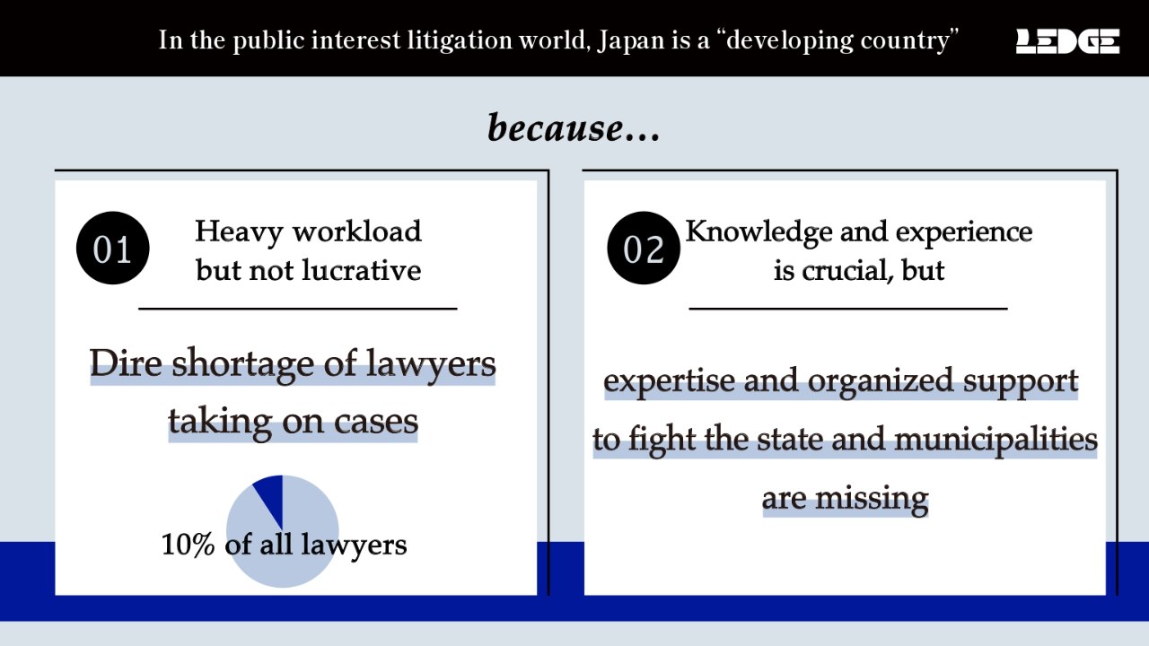 In Japan, there is a dire shortage of lawyers who work on public interest litigation, because it is not lucrative–lawyers work on a pro bono basis, even paying expenses like their own fees and litigation costs out of pocket, and devote a significant amount of time to them. Even active lawyers who are passionate about bringing about change would work on only 2 to 3 cases at most in their lifetime.