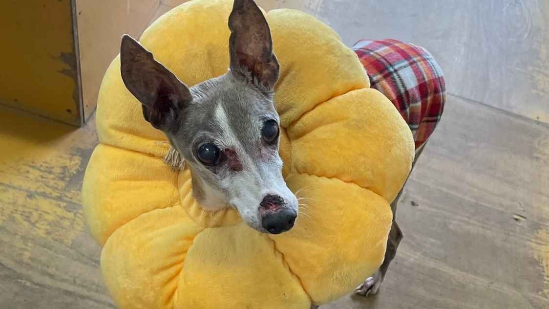 生年月日:2011/6/3性別:メス(避妊済み)年齢:14歳犬種:イタリアングレイハウンド体重:6.7kg病気:角膜炎があり、現在点眼薬で治療中。また指間びらんも、治療中で徐々に良化している様子です。
