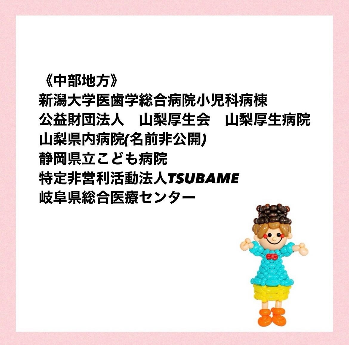2023年、このプロジェクトにご賛同いただいた下記の全国20ヶ所の病院・重症児デイケアサービス様に送らせていただくことになりました! まずは中部地方で送らせていただく病院はこちら🏥 ご賛同いただき、応募してくださった病院の皆様ありがとうございました! 《中部地方》 新潟大学医歯学総合病院小児科病棟 公益財団法人 山梨厚生会 山梨厚生病院 山梨県内病院(名前非公開) 静岡県立こども病院 特定非営利活動法人TSUBAME 岐阜県総合医療センター