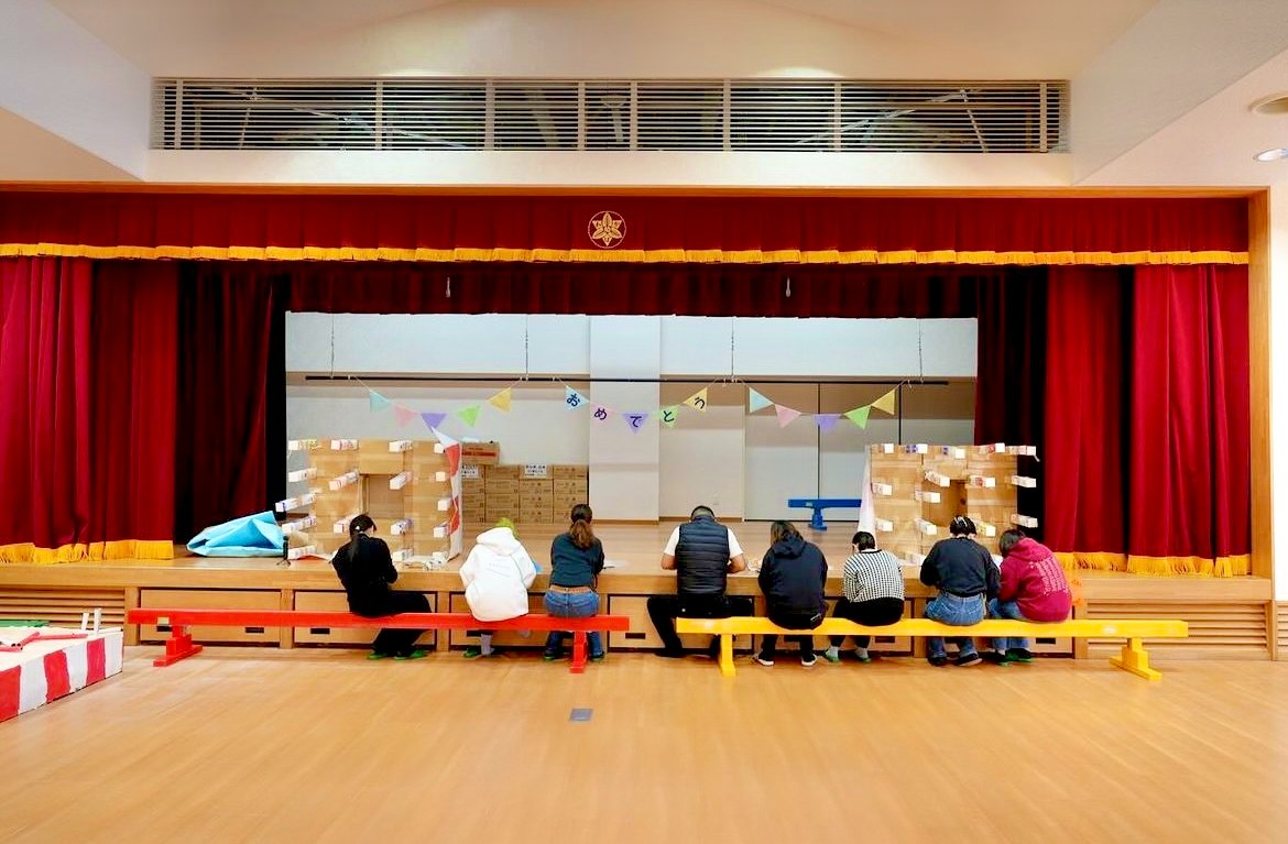 12月10日(日)に発送作業を行いました! 作業場所は府中わかば幼稚園のホールをお借りさせて頂きました。 高野府中市市長、府中わかば幼稚園の皆様、ありがとうございました! そして、今回、小学生から、社会人まで計13名のボランティアサポートメンバーの皆さんが集まってくださいました! 幼稚園という場所をお借りしたので、平均台に座ってカッティング作業からスタート♪