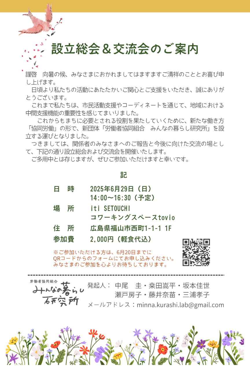 私たちは、福山初の「協同労働」団体設立のために準備をすすめている、福山市まちづくりサポートセンターの元スタッフです。
