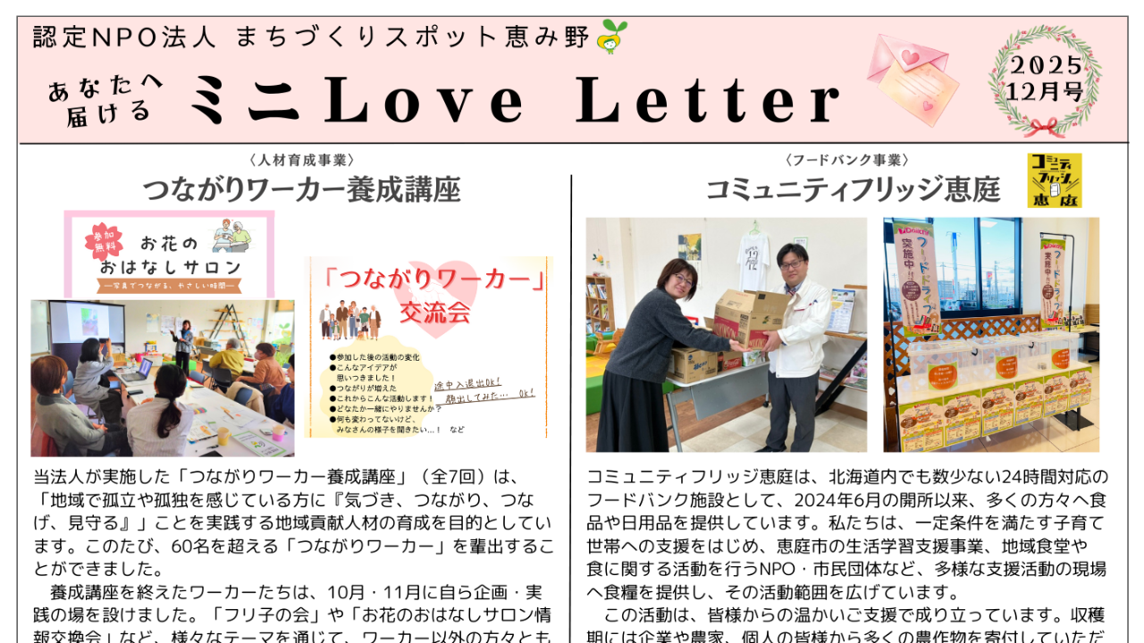まちスポ恵み野は、地域社会をとりまくさまざまな課題の解決と地域コミュニティの活性化を目的として2015年10月に設立した認定NPO法人です。商業施設『フレスポ恵み野(北海道恵庭市)』に活動拠点を置き、交流スペースの運営や、地域の市民活動団体やNPOの活動を中間支援組織として支援しています。