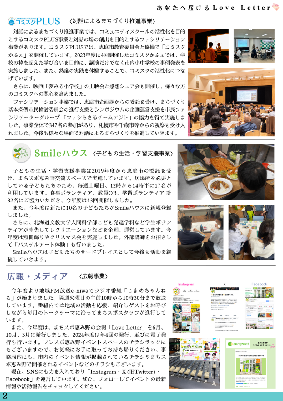 まちスポ恵み野では、定期的に活動報告として「あなたへ届けるLove Letter」を発行しています。 2023年度の活動をまとめたLove Letterを掲載します。 ぜひご一読ください!