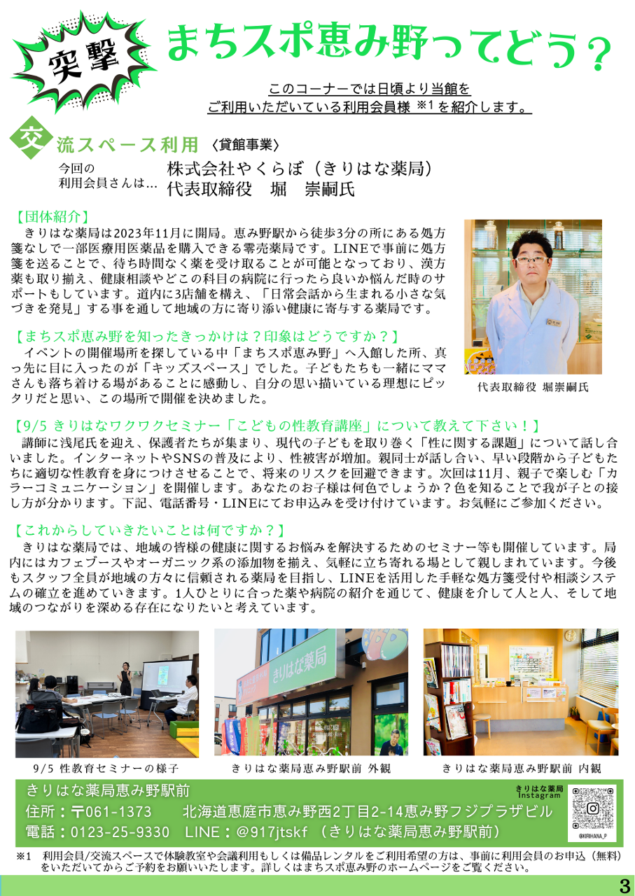まちスポ恵み野は、地域社会をとりまくさまざまな課題の解決と地域コミュニティの活性化を目的として2015年10月に設立した認定NPO法人です。商業施設『フレスポ恵み野(北海道恵庭市)』に活動拠点を置き、交流スペースの運営や、地域の市民活動団体やNPOの活動を中間支援組織として支援しています。