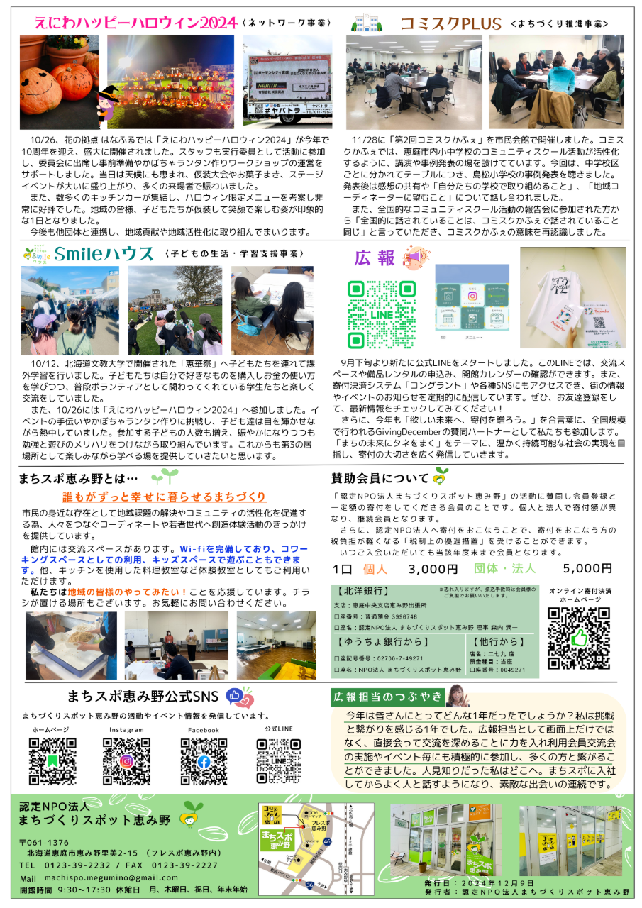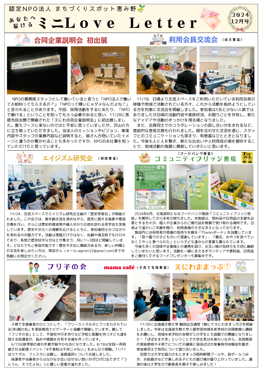 10月から12月までの活動報告です。現在まちスポ恵み野では新しいスタッフを募集しており、えにわ合同企業説明会にも初出展しました。また、かねてよりやってみたい!と考えていた利用会員交流会も実現できました。 賛助会員の皆様にはいつも温かいご支援をいただき、スタッフ一同厚く御礼申し上げます。新年も市民の皆様が暮らしやすいまちづくりに尽力いたしますので、引き続きよろしくお願いいたします!
